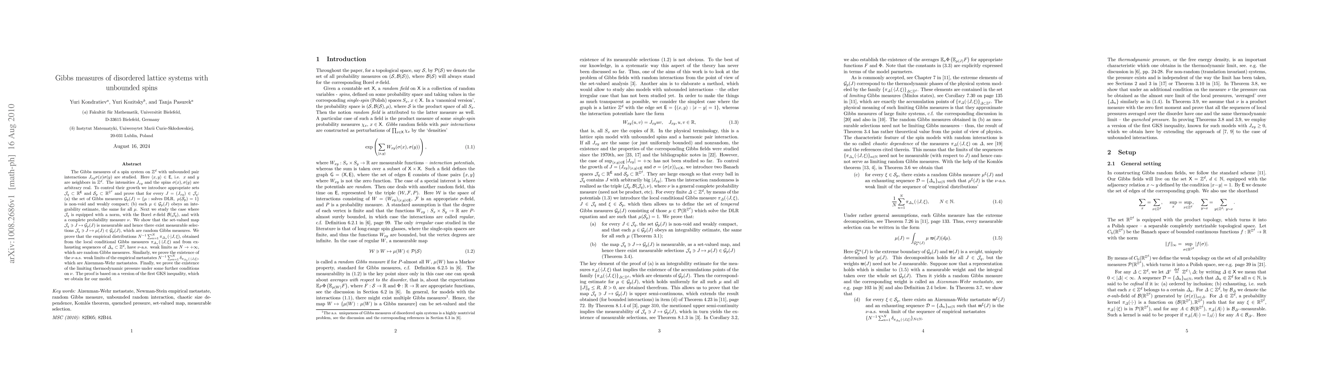 This paper investigates Gibbs measures for disordered lattice spin systems with unbounded interactions. It establishes the existence and weak compactness of Gibbs measures under certain growth conditions and proves the measurability of the map linking interaction parameters to Gibbs measures, leading to the existence of random Gibbs measures and their empirical limits.