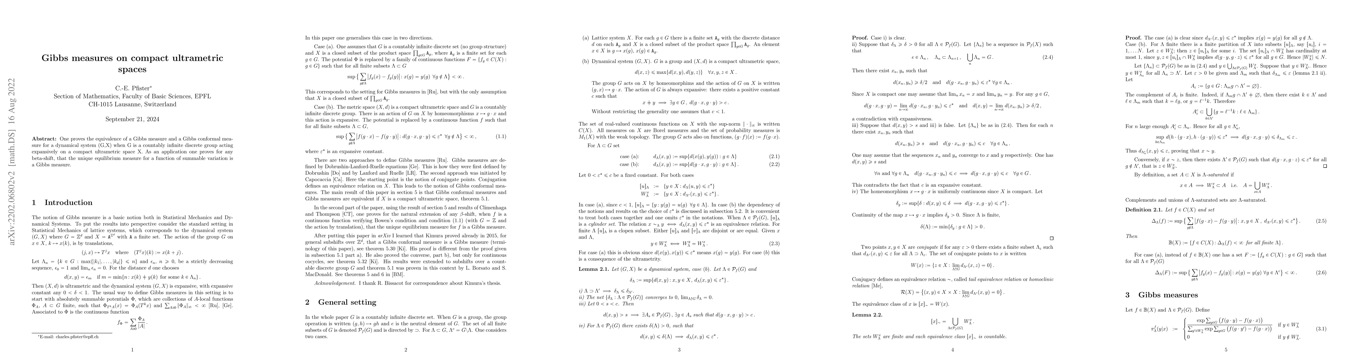 This paper establishes the equivalence between Gibbs measures and Gibbs conformal measures for a dynamical system on a compact ultrametric space, demonstrating that the unique equilibrium measure for a beta-shift with summable variation is a Gibbs measure.