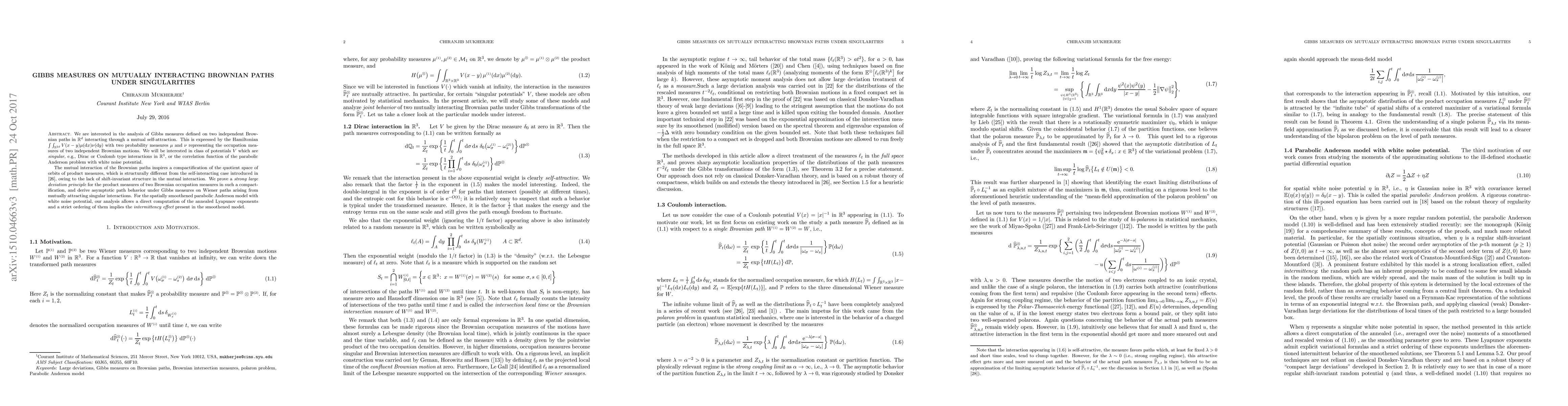 We are interested in the analysis of Gibbs measures defined on two independent Brownian paths in $\mathbb R^d$ interacting through a mutual self-attraction. This is expressed by the Hamiltonian $\int\int_{\mathbb R^{2d}} V(x-y) \mu(d x)\nu(d y)$ with two probability measures $\mu$ and $\nu$ representing the occupation measures of two independent Brownian motions. We will be interested in class of potentials $V$ which are {\it{singular}}, e.g., Dirac or Coulomb type interactions in $\mathbb R^3$, or the correlation function of the parabolic Anderson problem with white noise potential. The mutual interaction of the Brownian paths inspires a compactification of the quotient space of orbits of product measures, which is structurally different from the self-interacting case introduced in \cite{MV14}, owing to the lack of shift-invariant structure in the mutual interaction. We prove a {\it{strong large deviation principle}} for the product measures of two Brownian occupation measures in such a compactification, and derive asymptotic path behavior under Gibbs measures on Wiener paths arising from mutually attracting singular interactions. For the spatially smoothened parabolic Anderson model with white noise potential, our analysis allows a direct computation of the annealed Lyapunov exponents and a strict ordering of them implies the {\it{intermittency effect}} present in the smoothened model.