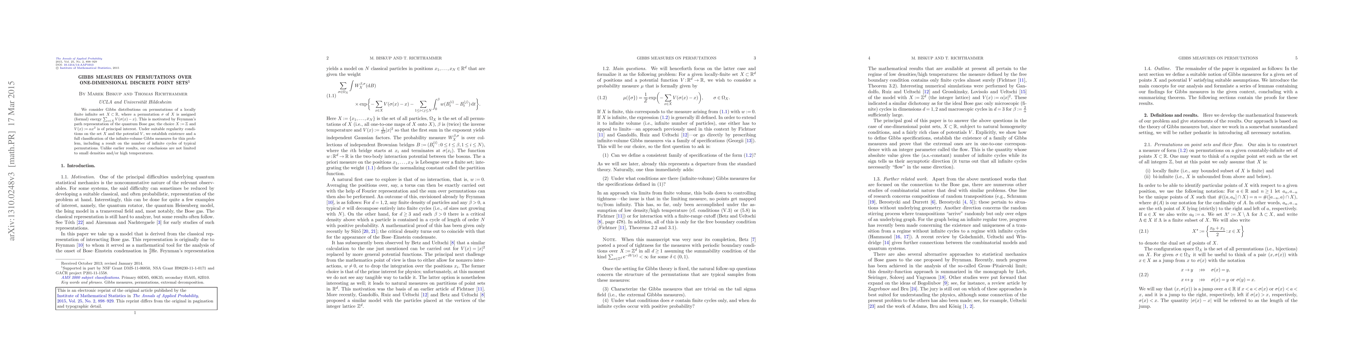 Researchers investigate Gibbs distributions on permutations of a one-dimensional discrete point set, establishing existence and classification for infinite-volume measures under suitable conditions, including results on cycle types.