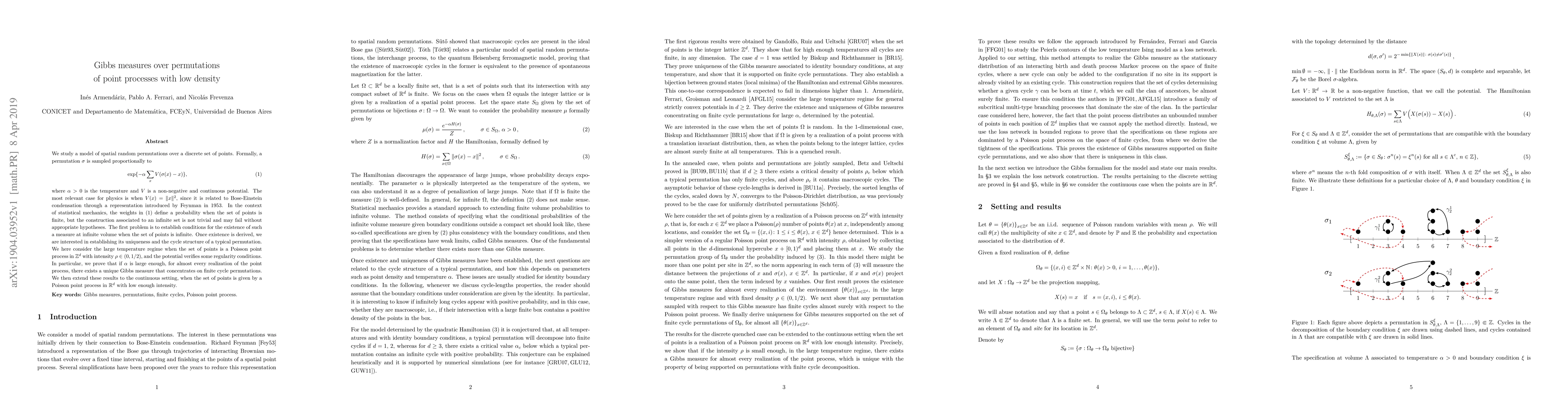 We study a model of spatial random permutations over a discrete set of points. Formally, a permutation $\sigma$ is sampled proportionally to the weight $\exp\{-\alpha \sum_x V(\sigma(x)-x)\},$ where $\alpha>0$ is the temperature and $V$ is a non-negative and continuous potential. The most relevant case for physics is when $V(x)=\|x\|^2$, since it is related to Bose-Einstein condensation through a representation introduced by Feynman in 1953. In the context of statistical mechanics, the weights define a probability when the set of points is finite, but the construction associated to an infinite set is not trivial and may fail without appropriate hypotheses. The first problem is to establish conditions for the existence of such a measure at infinite volume when the set of points is infinite. Once existence is derived, we are interested in establishing its uniqueness and the cycle structure of a typical permutation. We here consider the large temperature regime when the set of points is a Poisson point process in $\mathbb{Z}^d$ with intensity $\rho \in(0,1/2)$, and the potential verifies some regularity conditions. In particular, we prove that if $\alpha$ is large enough, for almost every realization of the point process, there exists a unique Gibbs measure that concentrates on finite cycle permutations. We then extend these results to the continuous setting, when the set of points is given by a Poisson point process in $\mathbb{R}^d$ with low enough intensity.