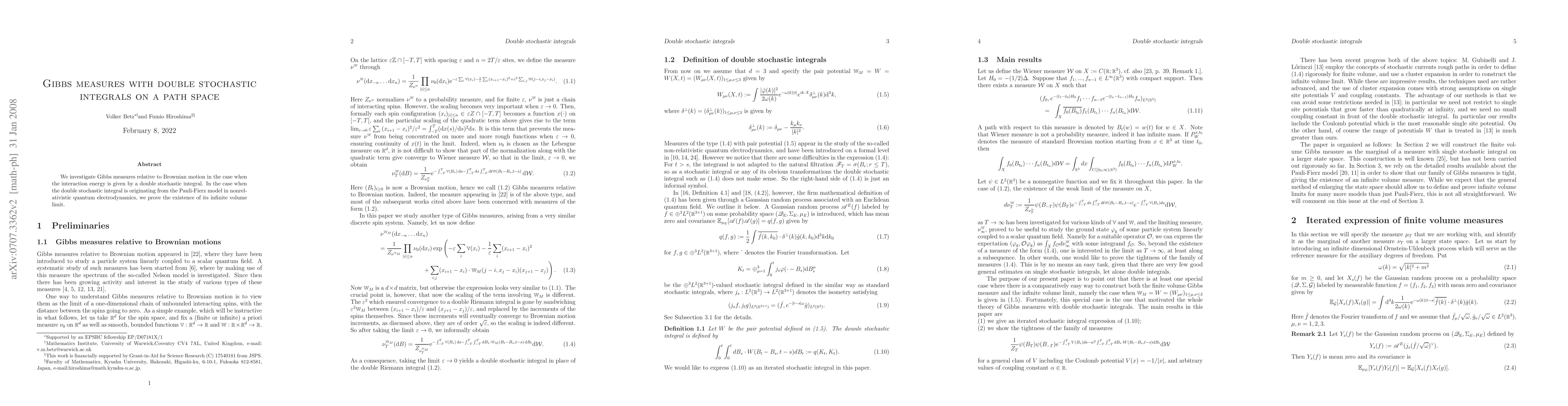 This paper explores Gibbs measures associated with Brownian motion where the interaction energy is defined by a double stochastic integral, particularly focusing on the Pauli-Fierz model in quantum electrodynamics. It establishes the existence of the infinite volume limit for these measures.