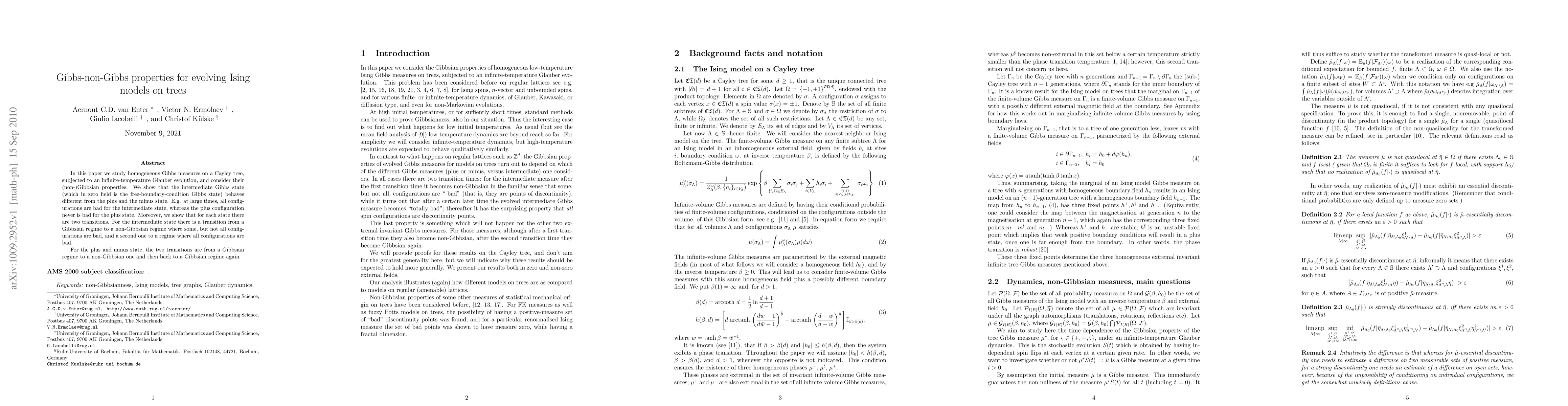 In this paper we study homogeneous Gibbs measures on a Cayley tree, subjected to an infinite-temperature Glauber evolution, and consider their (non-)Gibbsian properties. We show that the intermediate Gibbs state (which in zero field is the free-boundary-condition Gibbs state) behaves different from the plus and the minus state. E.g. at large times, all configurations are bad for the intermediate state, whereas the plus configuration never is bad for the plus state. Moreover, we show that for each state there are two transitions. For the intermediate state there is a transition from a Gibbsian regime to a non-Gibbsian regime where some, but not all configurations are bad, and a second one to a regime where all configurations are bad. For the plus and minus state, the two transitions are from a Gibbsian regime to a non-Gibbsian one and then back to a Gibbsian regime again.