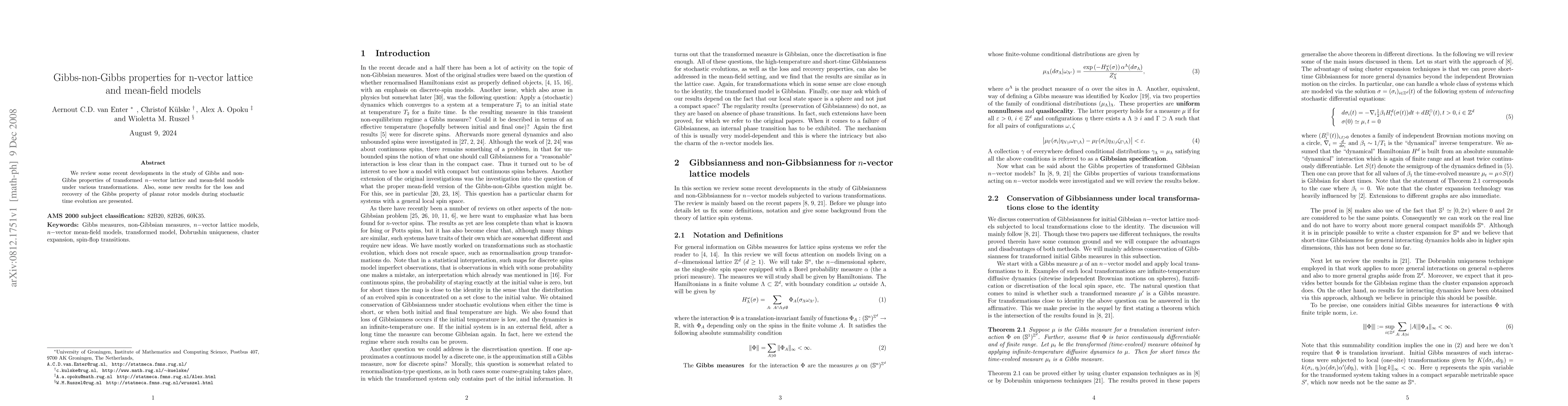 We review some recent developments in the study of Gibbs and non-Gibbs properties of transformed n-vector lattice and mean-field models under various transformations. Also, some new results for the loss and recovery of the Gibbs property of planar rotor models during stochastic time evolution are presented.