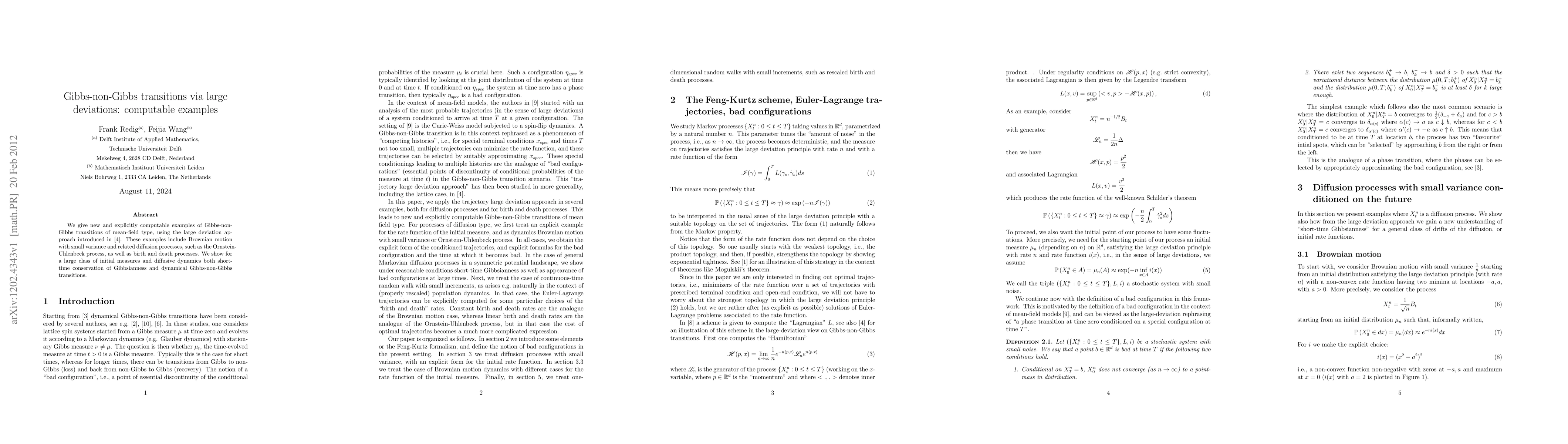 We give new and explicitly computable examples of Gibbs-non-Gibbs transitions of mean-field type, using the large deviation approach introduced in [4]. These examples include Brownian motion with small variance and related diffusion processes, such as the Ornstein-Uhlenbeck process, as well as birth and death processes. We show for a large class of initial measures and diffusive dynamics both short-time conservation of Gibbsianness and dynamical Gibbs-non-Gibbs transitions.