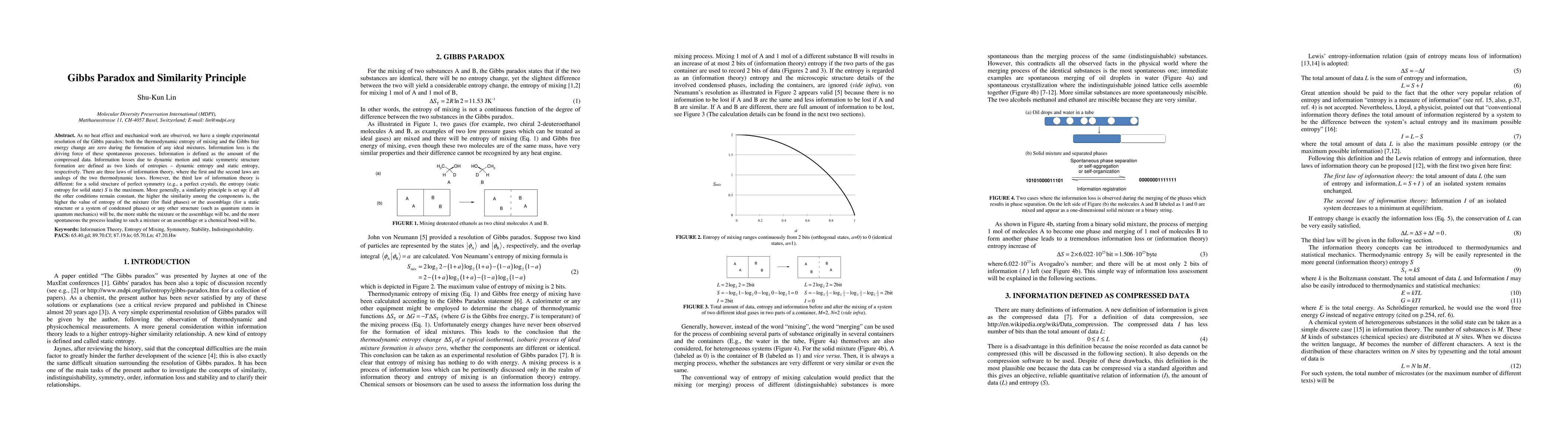 The paper resolves the Gibbs paradox by demonstrating that no heat effect or mechanical work occurs during the formation of ideal mixtures, with zero thermodynamic entropy of mixing and Gibbs free energy change. It introduces the concept of information loss as a driving force, defining dynamic and static entropies, and establishes a similarity principle that correlates higher component similarity with greater entropy and stability in mixtures or assemblages.