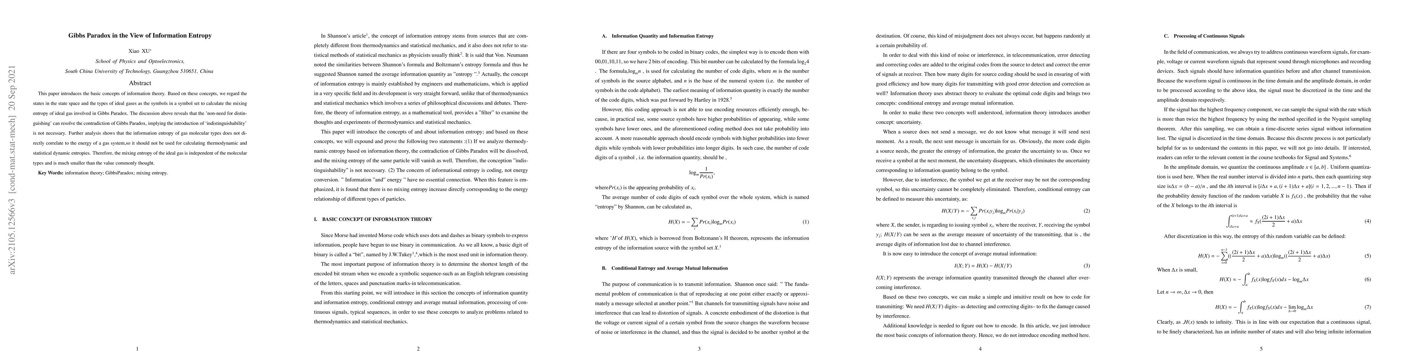 This paper uses information theory to resolve the Gibbs Paradox by treating gas states as symbols, showing that indistinguishability is unnecessary. It concludes that information entropy of gas molecular types does not correlate with energy, leading to a smaller mixing entropy than previously thought.