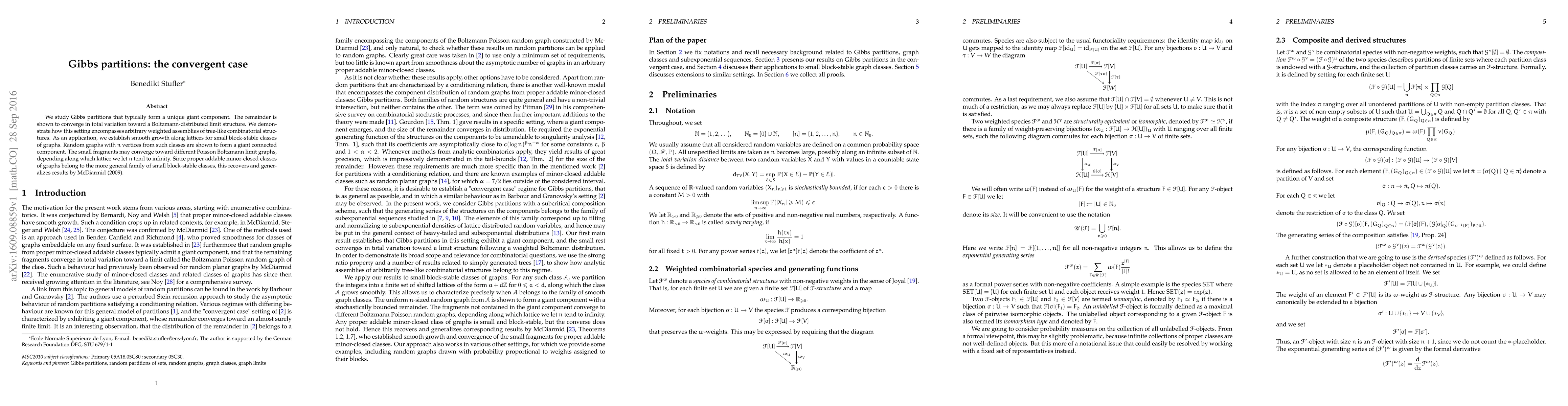 We study Gibbs partitions that typically form a unique giant component. The remainder is shown to converge in total variation toward a Boltzmann-distributed limit structure. We demon- strate how this setting encompasses arbitrary weighted assemblies of tree-like combinatorial structures. As an application, we establish smooth growth along lattices for small block-stable classes of graphs. Random graphs with n vertices from such classes are shown to form a giant connected component. The small fragments may converge toward different Poisson Boltzmann limit graphs, depending along which lattice we let n tend to infinity. Since proper addable minor-closed classes of graphs belong to the more general family of small block-stable classes, this recovers and generalizes results by McDiarmid (2009).