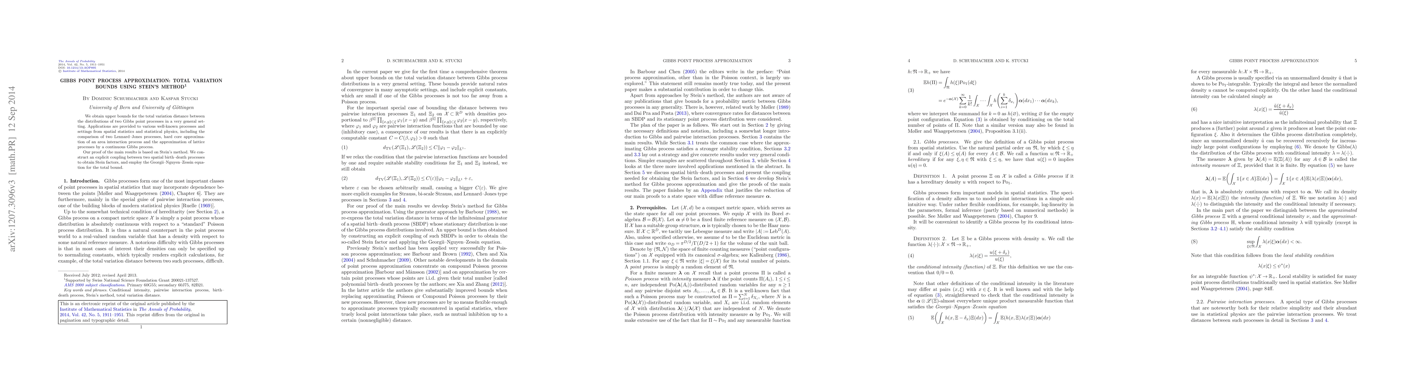 This paper provides upper bounds for the total variation distance between two Gibbs point processes using Stein's method. It applies these bounds to various spatial statistics and statistical physics processes, employing an explicit coupling and the Georgii-Nguyen-Zessin equation for the total bound.