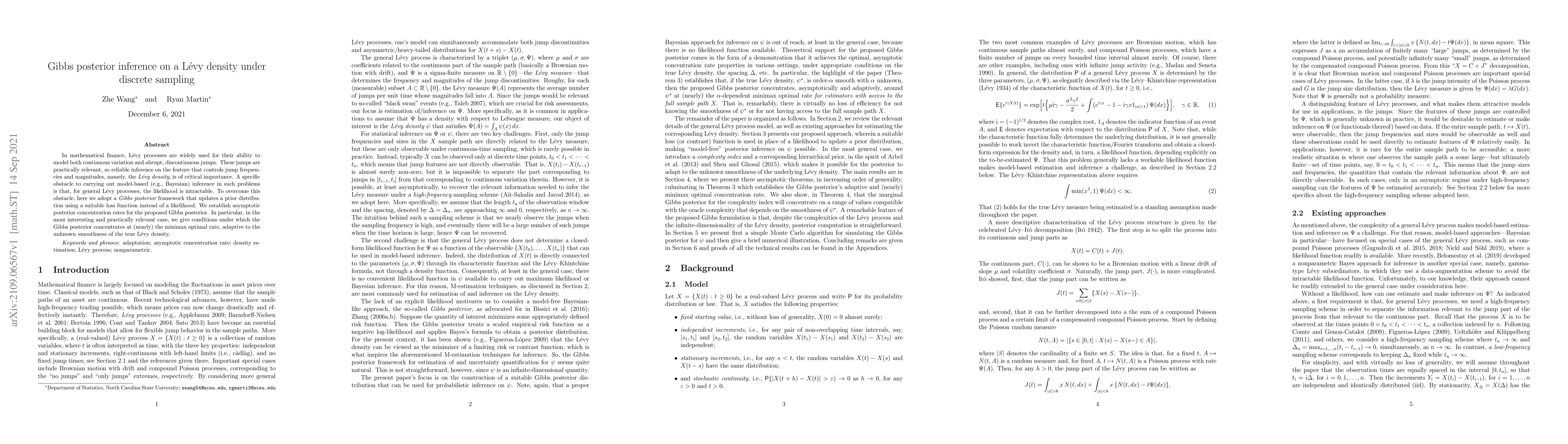 This paper proposes a Gibbs posterior framework for inferring the Levy density in Levy processes, which are used in mathematical finance to model continuous variations and jumps. The authors establish asymptotic posterior concentration rates, showing that the Gibbs posterior can adaptively achieve nearly minimax optimal rates under suitable conditions.