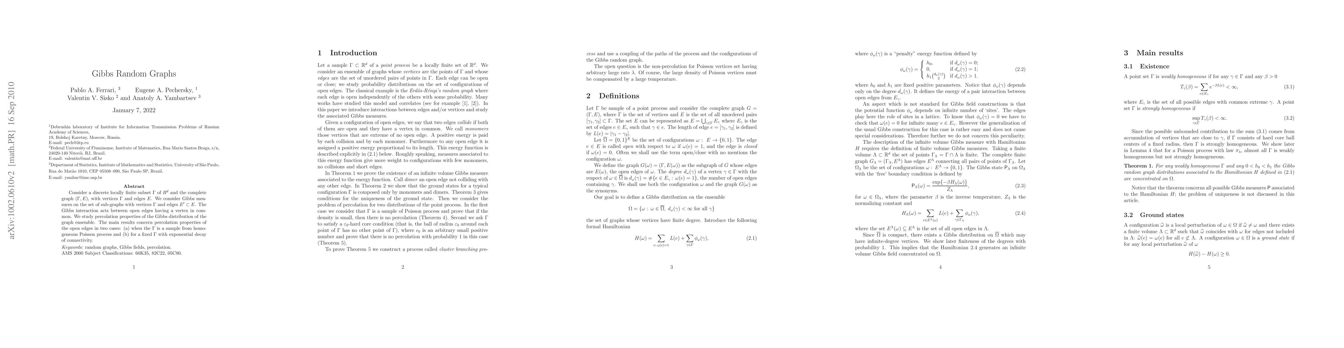 This research paper explores percolation properties of a graph ensemble generated by Gibbs measures on sub-graphs with vertices from a discrete subset η and edges, focusing on cases where the subset comes from a Poisson process or has exponential decay of connectivity.