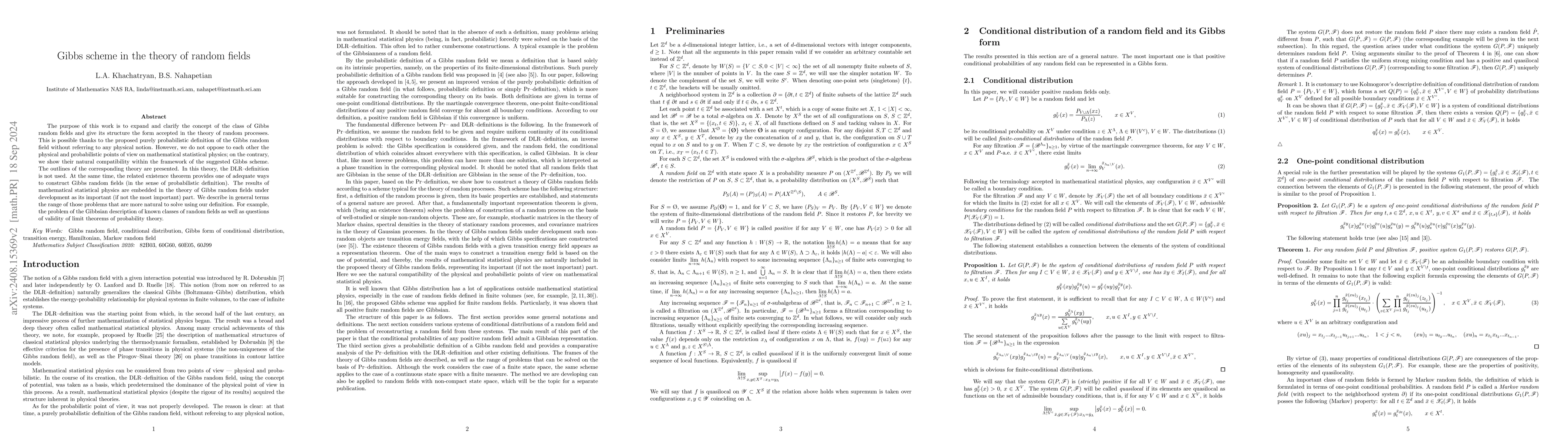 The purpose of this work is to expand and clarify the concept of the class of Gibbs random fields and give its structure the form accepted in the theory of random processes. It is possible thanks to the proposed purely probabilistic definition of the Gibbs random field without refereing to any physical notion. However, we do not oppose to each other the physical and probabilistic points of view on mathematical statistical physics; on the contrary, we show their natural compatibility within the framework of the suggested Gibbs scheme. The outlines of the corresponding theory are presented. In this theory, the DLR--definition is not used. At the same time, the related existence theorem provides one of adequate ways to construct Gibbs random fields (in the sense of probabilistic definition). The results of mathematical statistical physics are embedded in the theory of Gibbs random fields under development as its important (if not the most important) part. We describe in general terms the range of those problems that are more natural to solve using our definition. For example, the problem of the Gibbsian description of known classes of random fields as well as questions of validity of limit theorems of probability theory.