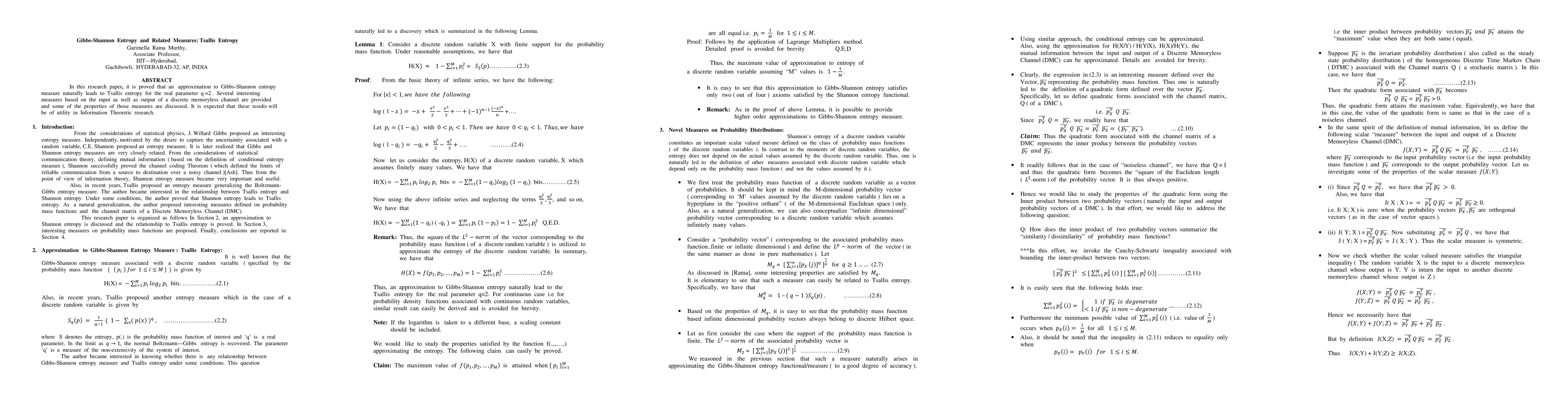 This paper demonstrates that an approximation to Gibbs-Shannon entropy leads to Tsallis entropy when the parameter q equals 2. It also introduces several measures related to a discrete memoryless channel and discusses their properties, aiming to enhance information theoretic research.