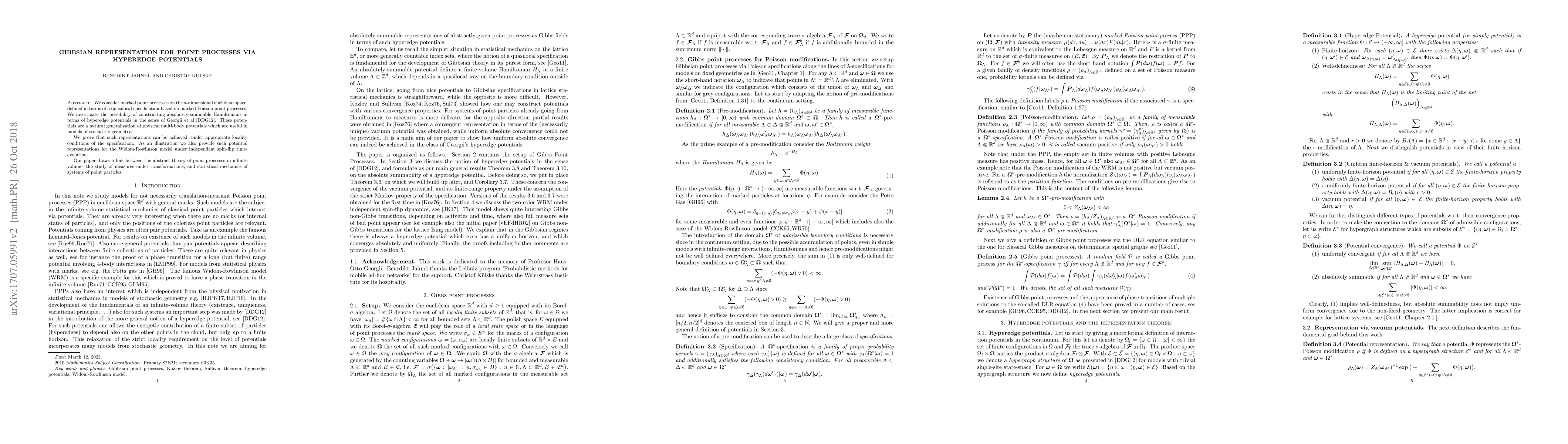 This paper explores marked point processes on d-dimensional Euclidean space, constructing absolutely-summable Hamiltonians via hyperedge potentials. It establishes the feasibility of these representations under specific locality conditions, linking point processes theory, measure transformations, and statistical mechanics.