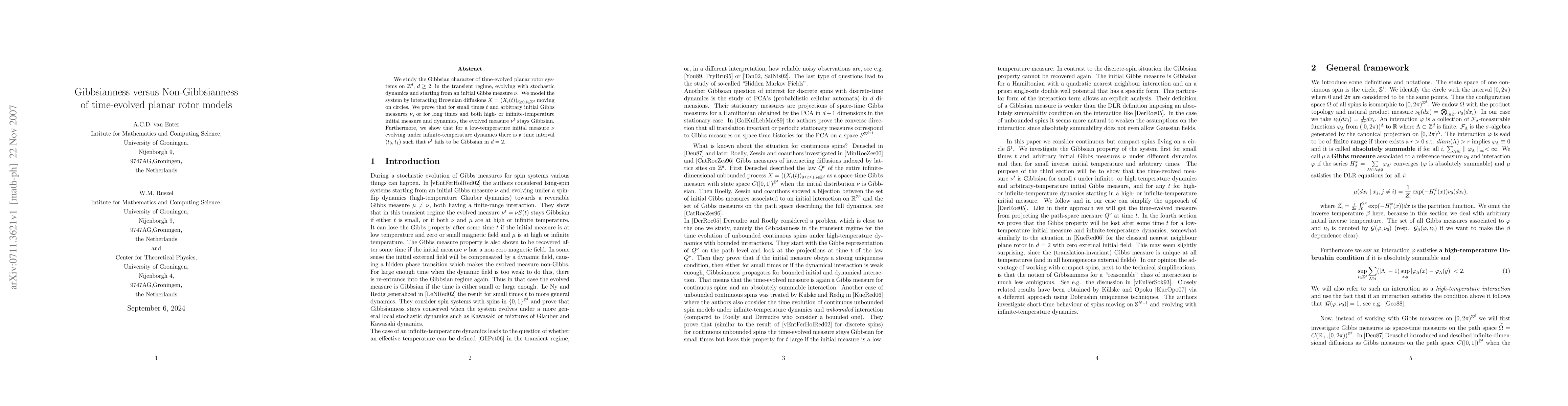 This paper investigates the Gibbsian properties of time-evolved planar rotor systems under stochastic dynamics, showing that the evolved measure remains Gibbsian for small or long times. However, for low-temperature initial measures evolving under infinite-temperature dynamics, the system loses Gibbsianness in a specific time interval.