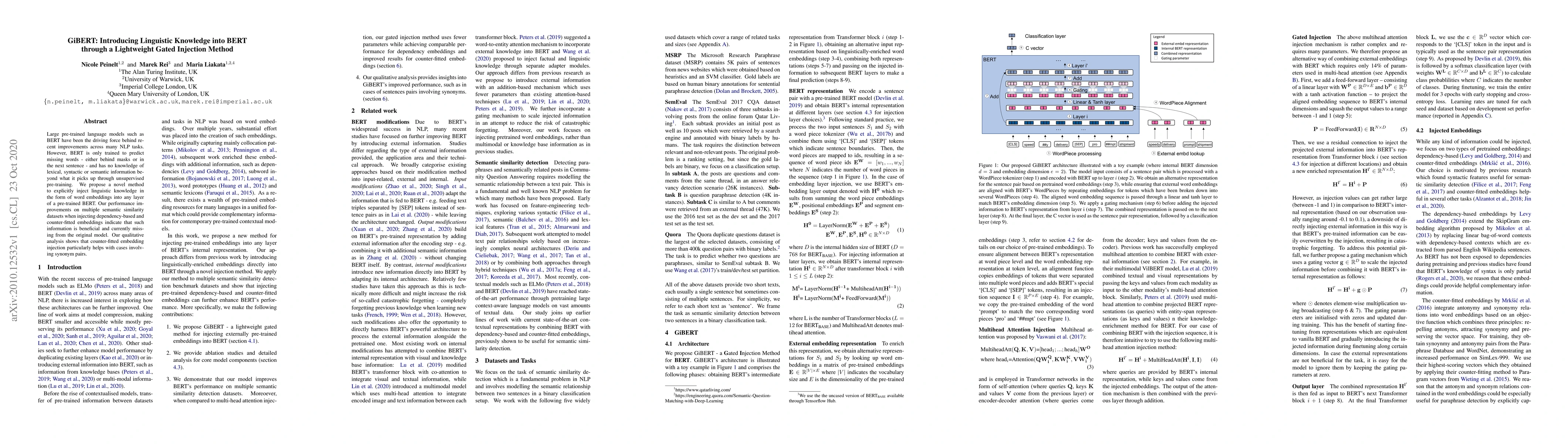 GiBERT introduces a lightweight gated injection method to incorporate linguistic knowledge into BERT by embedding lexical and syntactic information. Performance gains on semantic similarity tasks demonstrate that this explicit knowledge enhances BERT's capabilities, especially for synonym pair recognition.