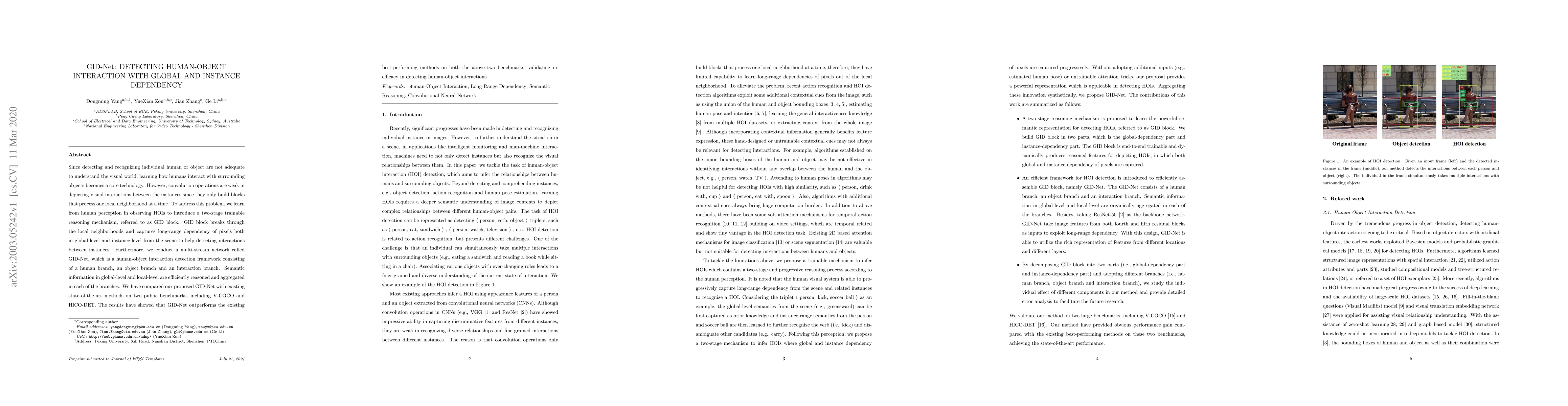 GID-Net introduces a two-stage reasoning mechanism called GID block to detect human-object interactions by capturing long-range dependencies at both global and instance levels. The multi-stream network GID-Net outperforms existing methods on V-COCO and HICO-DET benchmarks, demonstrating its effectiveness.