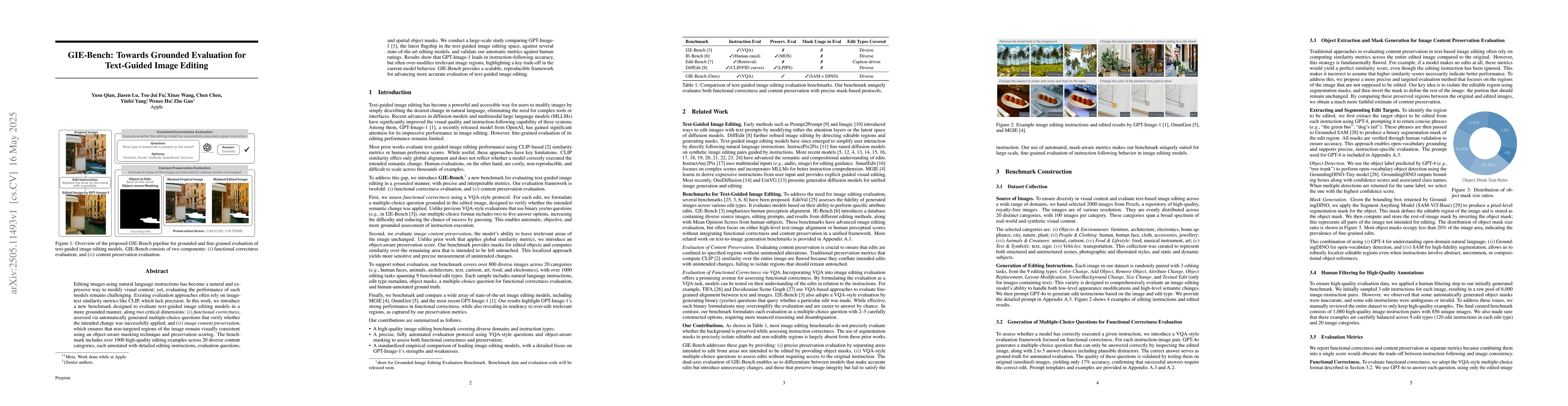 The research introduces GIE-Bench, a benchmark for evaluating text-guided image editing models. It assesses functional correctness through automatically generated multiple-choice questions and image content preservation using object-aware masking techniques. The benchmark includes over 1000 high-quality editing examples across 20 categories, annotated with detailed instructions, evaluation questions, and spatial object masks.