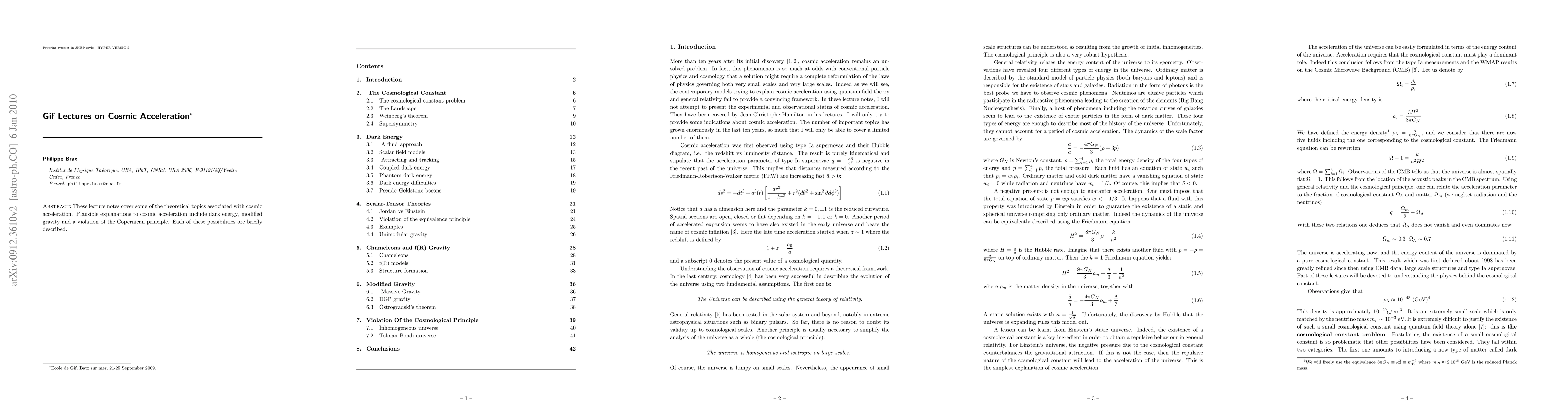 The paper presents a comprehensive analysis of cosmic acceleration theories, including dark energy, modified gravity, and violations of the Copernican principle, using lecture notes format.