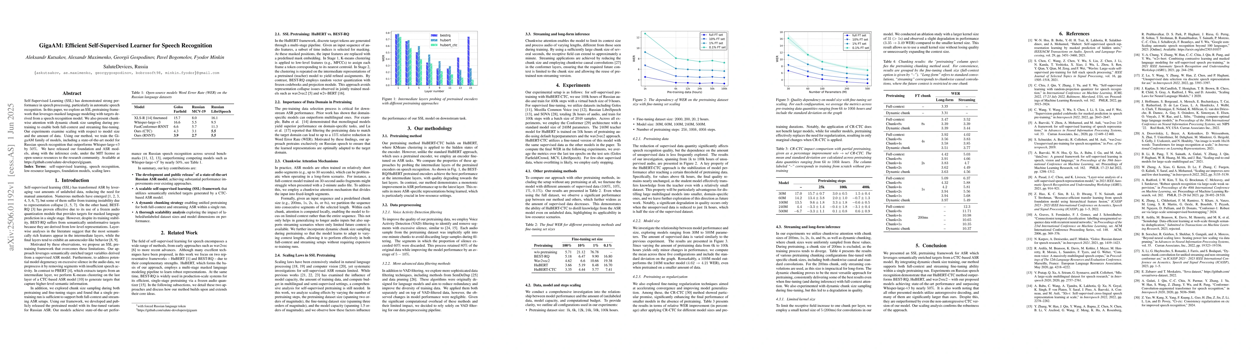 The main technical contribution is the development of an efficient self-supervised learner (GigaAM) for speech recognition, incorporating chunkwise attention and dynamic chunk size sampling for flexible fine-tuning.