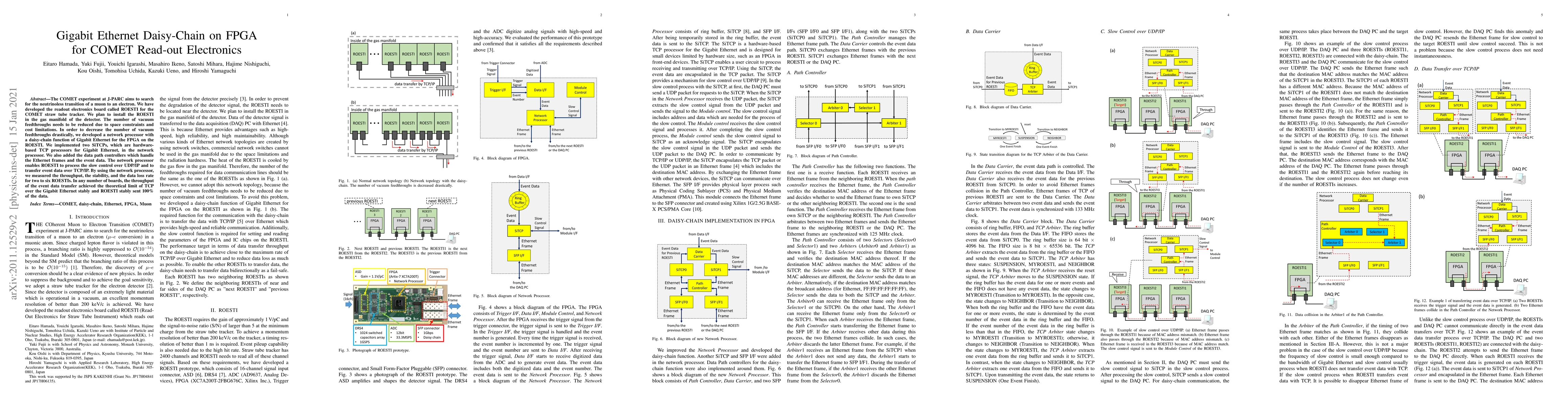 This paper details the development of a Gigabit Ethernet daisy-chain network processor on an FPGA for the ROESTI readout electronics in the COMET experiment, which aims to reduce vacuum feedthroughs. The network processor achieved stable data transfer at theoretical limits with 100% data transmission efficiency.