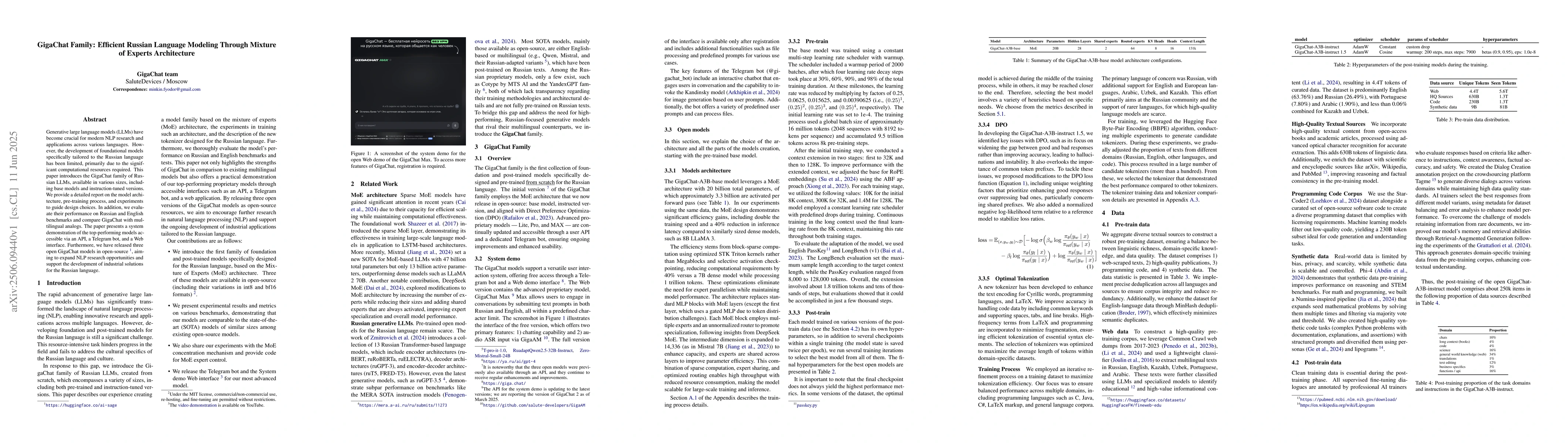 This paper introduces GigaChat, a family of Russian language models that overcome computational resource limitations, offering a range of models for NLP research and industrial applications.
