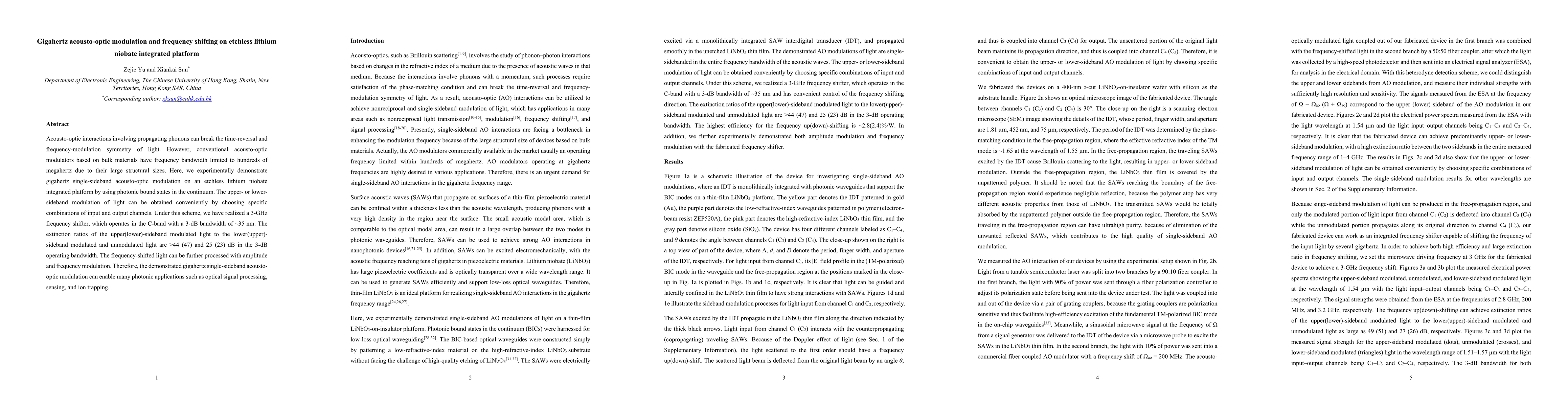 This paper demonstrates gigahertz single-sideband acousto-optic modulation on an etchless lithium niobate platform, achieving a 3-GHz frequency shifter with high extinction ratios, and enabling applications in optical signal processing and sensing.