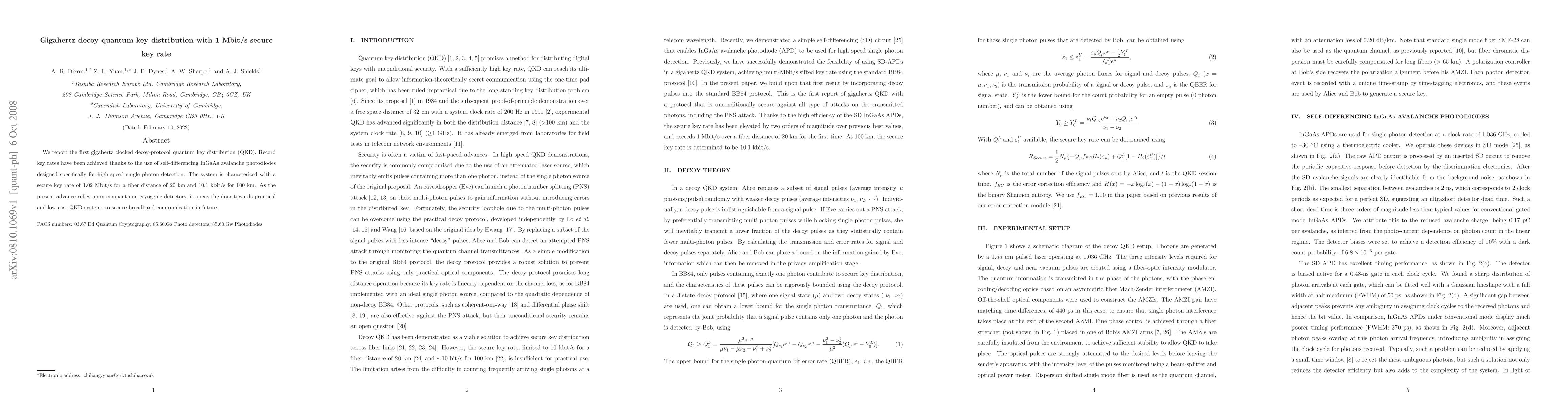 This paper presents a groundbreaking gigahertz decoy-protocol quantum key distribution (QKD) system achieving a secure key rate of 1.02 Mbit/s over 20 km and 10.1 kbit/s over 100 km, utilizing high-speed InGaAs avalanche photodiodes, paving the way for practical, low-cost QKD for future broadband communications.