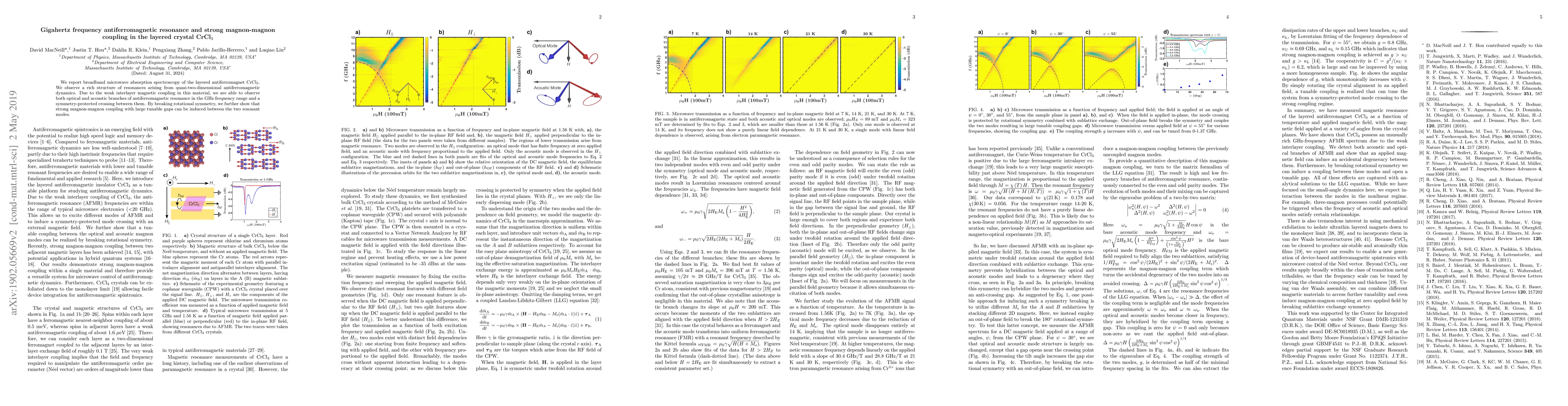 This study utilizes microwave absorption spectroscopy to explore the antiferromagnetic resonance in the layered crystal CrCl3, revealing distinct GHz frequency resonances and strong tunable magnon-magnon coupling due to weak interlayer magnetic interactions. The research highlights a symmetry-protected crossing between optical and acoustic branches of antiferromagnetic resonance.