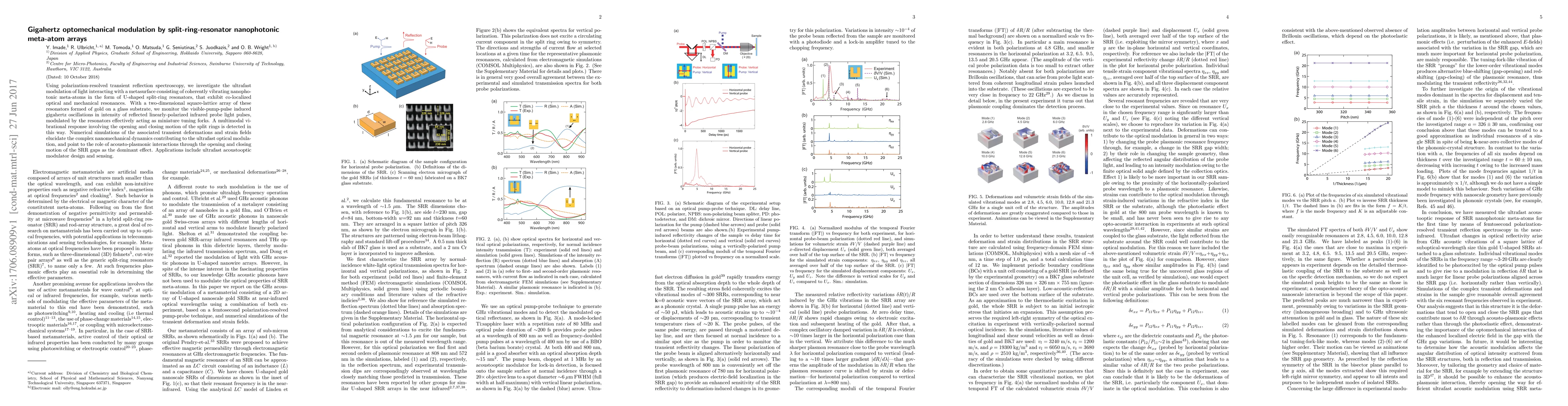 This research demonstrates the use of gold U-shaped split-ring resonator arrays on glass to modulate infrared light at gigahertz frequencies using visible light pulses. The resonators, acting like miniature tuning forks, exhibit complex nanomechanical dynamics involving opening and closing motions, enabling ultrafast optical modulation. Numerical simulations reveal acousto-plasmonic interactions as the primary effect, suggesting potential applications in ultrafast acoustooptic modulators and sensors.