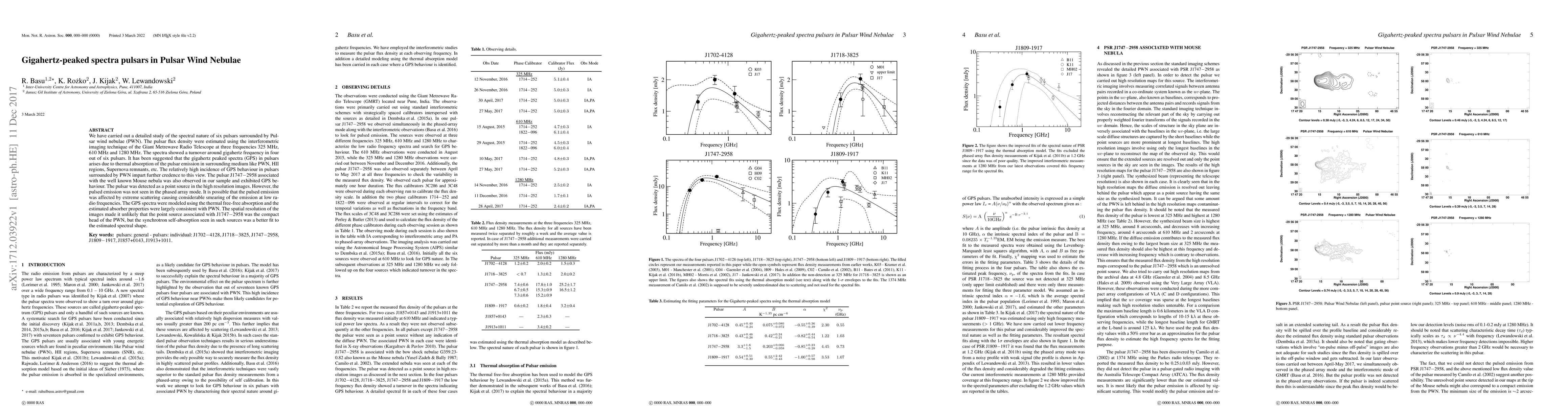 We have carried out a detailed study of the spectral nature of six pulsars surrounded by Pulsar wind nebulae (PWN). The pulsar flux density were estimated using the interferometric imaging technique of the Giant Metrewave Radio Telescope at three frequencies 325 MHz, 610 MHz and 1280 MHz. The spectra showed a turnover around gigahertz frequency in four out of six pulsars. It has been suggested that the gigahertz peaked spectra (GPS) in pulsars arises due to thermal absorption of the pulsar emission in surrounding medium like PWN, HII regions, Supernova remnants, etc. The relatively high incidence of GPS behaviour in pulsars surrounded by PWN impart further credence to this view. The pulsar J1747$-$2958 associated with the well known Mouse nebula was also observed in our sample and exhibited GPS behaviour. The pulsar was detected as a point source in the high resolution images. However, the pulsed emission was not seen in the phased array mode. It is possible that the pulsed emission was affected by extreme scattering causing considerable smearing of the emission at low radio frequencies. The GPS spectra were modeled using the thermal free-free absorption and the estimated absorber properties were largely consistent with PWN. The spatial resolution of the images made it unlikely that the point source associated with J1747$-$2958 was the compact head of the PWN, but the synchrotron self-absorption seen in such sources was a better fit to the estimated spectral shape.