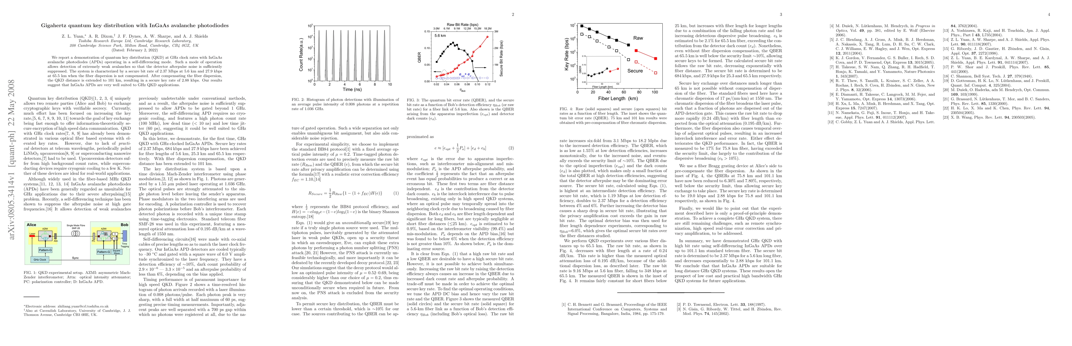 This paper demonstrates quantum key distribution (QKD) at gigahertz rates using InGaAs avalanche photodiodes in self-differencing mode, achieving secure bit rates up to 2.37 Mbps over 5.6 km and extending to 101 km with dispersion compensation.