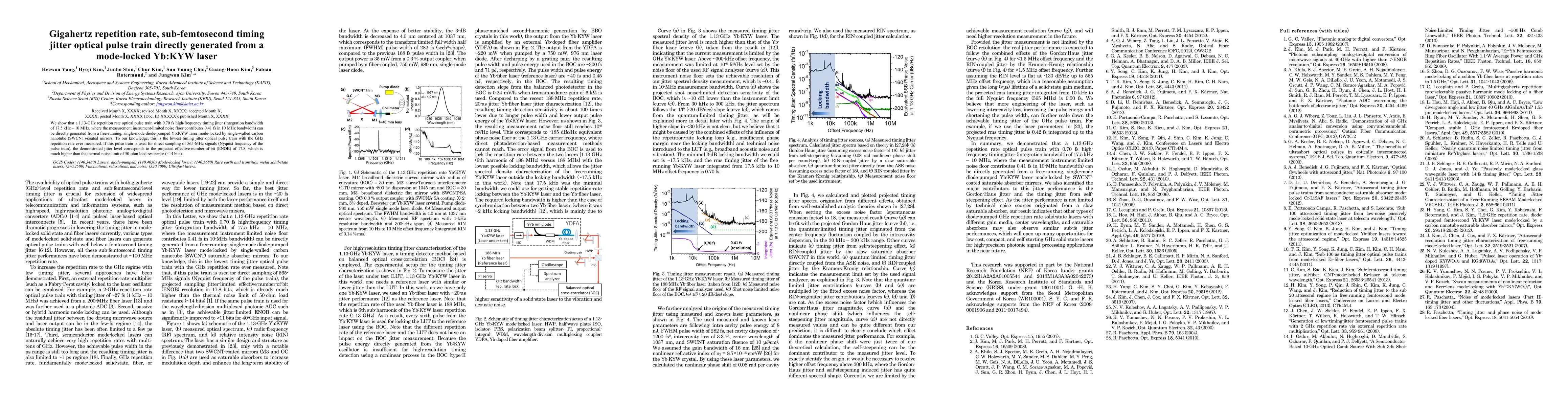 This paper demonstrates the generation of a 1.13-GHz repetition rate optical pulse train with exceptionally low 0.70 fs timing jitter from a mode-locked Yb:KYW laser, using single-walled carbon nanotube-coated mirrors. The achieved jitter level enables high-fidelity direct sampling of 565-MHz signals, projecting an effective-number-of-bit of 17.8, surpassing the thermal noise limit.
