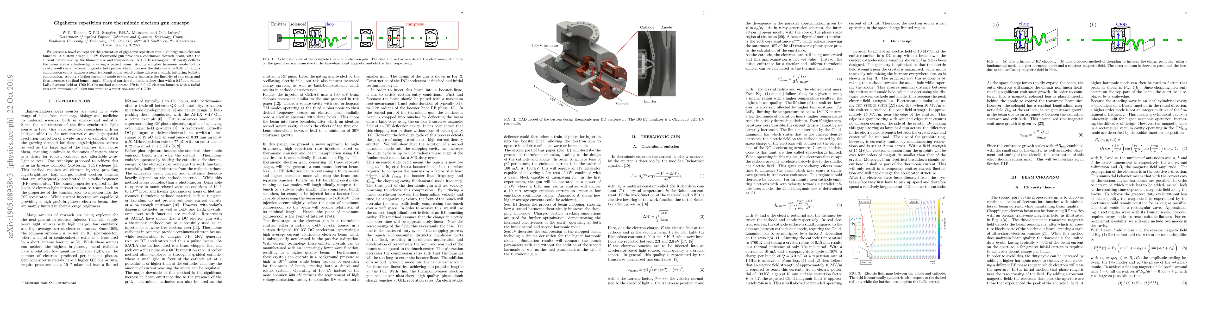 We present a novel concept for the generation of gigahertz repetition rate high brightness electron bunches. A custom design 100 kV thermionic gun provides a continuous electron beam, with the current determined by the filament size and temperature. A 1 GHz rectangular RF cavity deflects the beam across a knife-edge, creating a pulsed beam. Adding a higher harmonic mode to this cavity results in a flattened magnetic field profile which increases the duty cycle to 30%. Finally, a compression cavity induces a negative longitudinal velocity-time chirp in a bunch, initiating ballistic compression. Adding a higher harmonic mode to this cavity increases the linearity of this chirp and thus decreases the final bunch length. Charged particle simulations show that with a 0.15 mm radius LaB6 filament held at 1760 K, this method can create 279 fs, 3.0 pC electron bunches with a radial rms core emittance of 0.089 mm mrad at a repetition rate of 1 GHz.
