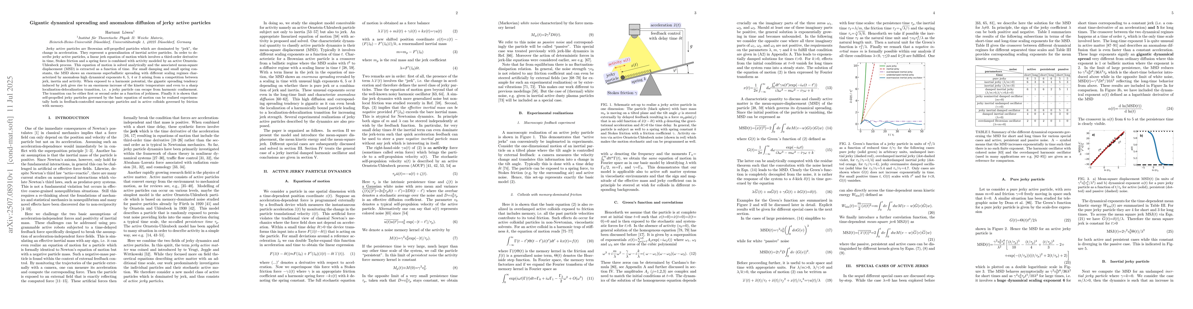 Jerky active particles are Brownian self-propelled particles which are dominated by ``jerk'', the change in acceleration. They represent a generalization of inertial active particles. In order to describe jerky active particles, a linear jerk equation of motion which involves a third-order derivative in time, Stokes friction and a spring force is combined with activity modeled by an active Ornstein-Uhlenbeck process. This equation of motion is solved analytically and the associated mean-square displacement (MSD) is extracted as a function of time. For small damping and small spring constants, the MSD shows an enormous superballistic spreading with different scaling regimes characterized by anomalous high dynamical exponents 6, 5, 4 or 3 arising from a competition between jerk, inertia and activity. When exposed to a harmonic potential, the gigantic spreading tendency induced by jerk gives rise to an enormous increase of the kinetic temperature and even to a sharp localization-delocalization transition, i.e. a jerky particle can escape from harmonic confinement. The transition can be either first or second order as a function of jerkiness. Finally it is shown that self-propelled jerky particles governed by the basic equation of motion can be realized experimentally both in feedback-controlled macroscopic particles and in active colloids governed by friction with memory.