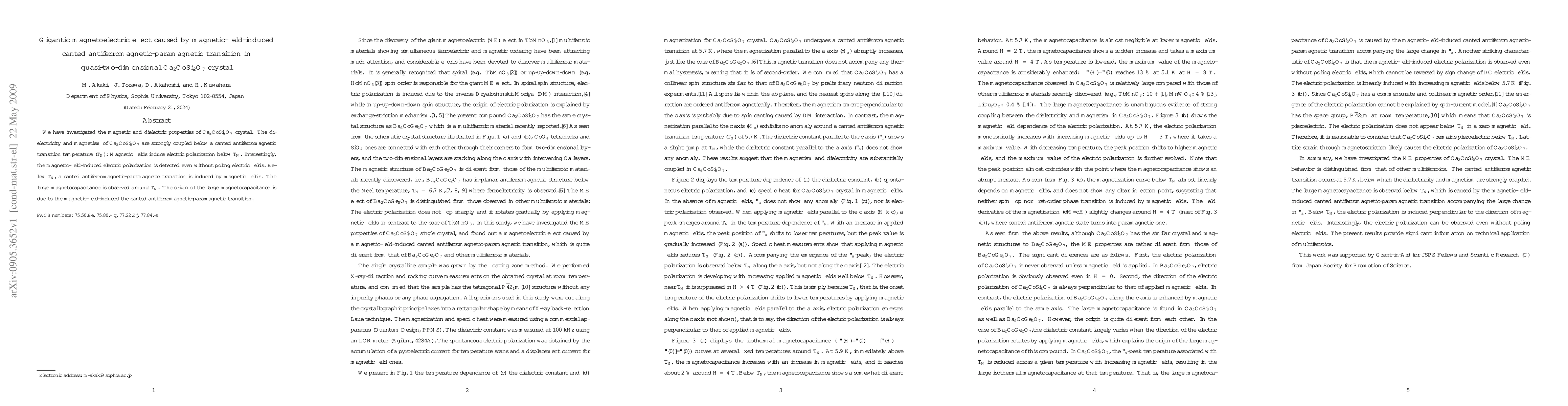 This paper investigates the magnetic and dielectric properties of Ca$_2$CoSi$_2$O$_7$ crystal, finding a gigantic magnetoelectric effect due to a magnetic-field-induced canted antiferromagnetic-paramagnetic transition, resulting in large magnetocapacitance around the transition temperature.