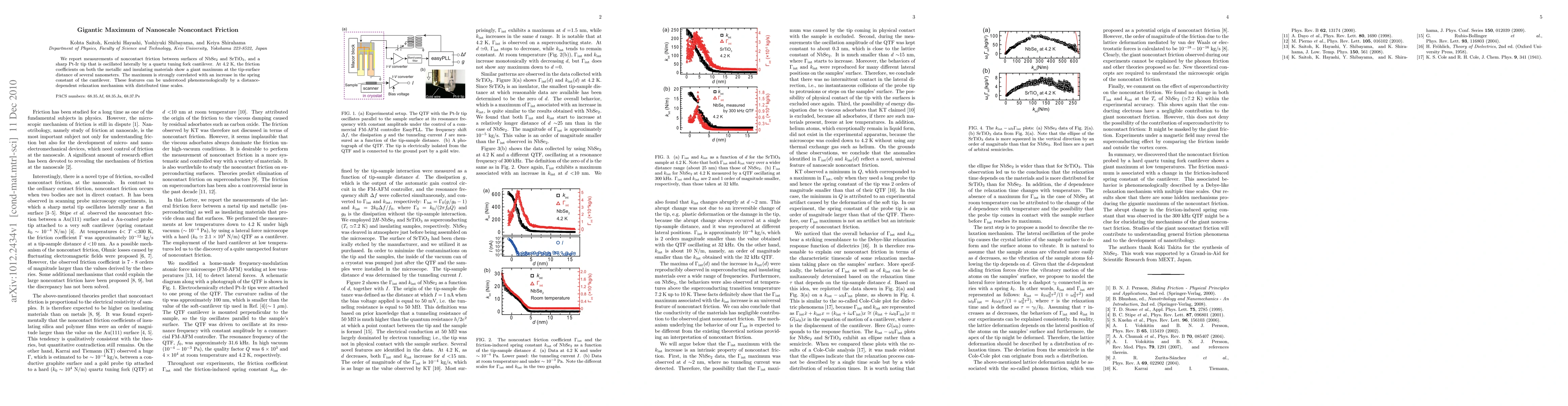Researchers measured noncontact friction between surfaces of NbSe2 and SrTiO3 at 4.2 K, finding a giant maximum in friction coefficients at nanometer distances, linked to cantilever spring constant changes.