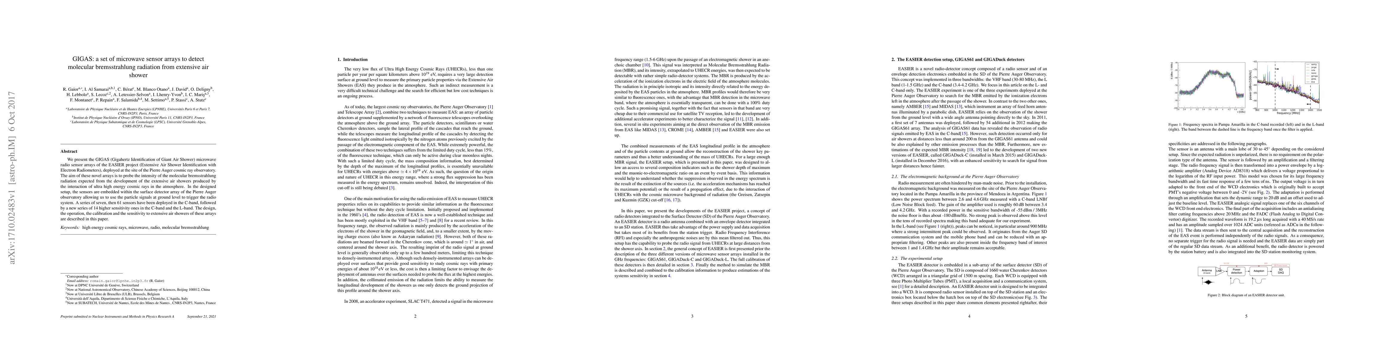 We present the GIGAS (Gigahertz Identification of Giant Air Shower) microwave radio sensor arrays of the EASIER project (Extensive Air Shower Identification with Electron Radiometers), deployed at the site of the Pierre Auger cosmic ray observatory. The aim of these novel arrays is to probe the intensity of the molecular bremsstrahlung radiation expected from the development of the extensive air showers produced by the interaction of ultra high energy cosmic rays in the atmosphere. In the designed setup, the sensors are embedded within the surface detector array of the Pierre Auger observatory allowing us to use the particle signals at ground level to trigger the radio system. A series of seven, then 61 sensors have been deployed in the C-band, followed by a new series of 14 higher sensitivity ones in the C-band and the L-band. The design, the operation, the calibration and the sensitivity to extensive air showers of these arrays are described in this paper.