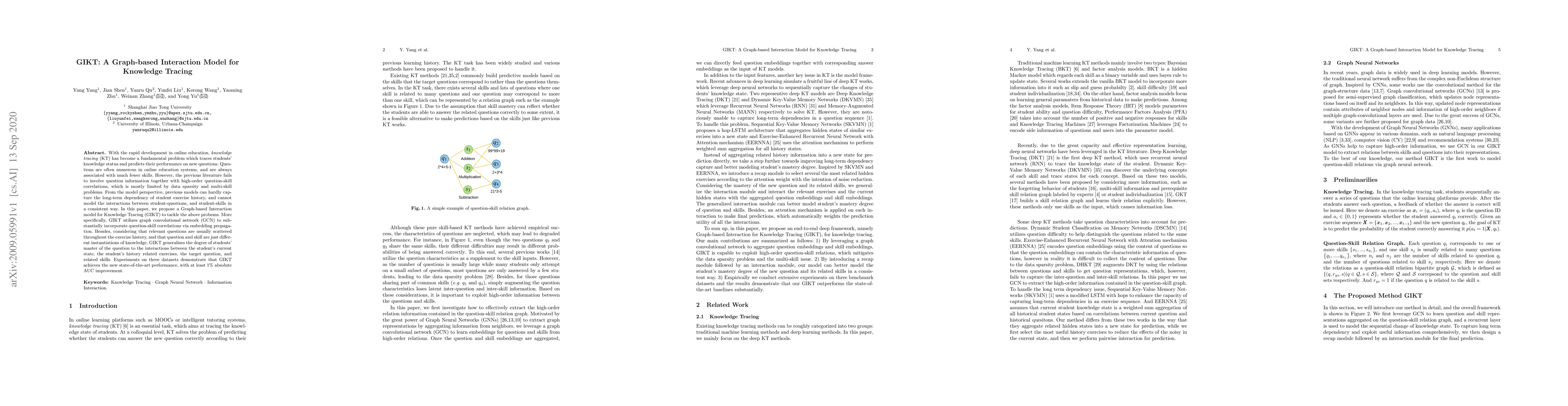With the rapid development in online education, knowledge tracing (KT) has become a fundamental problem which traces students' knowledge status and predicts their performance on new questions. Questions are often numerous in online education systems, and are always associated with much fewer skills. However, the previous literature fails to involve question information together with high-order question-skill correlations, which is mostly limited by data sparsity and multi-skill problems. From the model perspective, previous models can hardly capture the long-term dependency of student exercise history, and cannot model the interactions between student-questions, and student-skills in a consistent way. In this paper, we propose a Graph-based Interaction model for Knowledge Tracing (GIKT) to tackle the above probems. More specifically, GIKT utilizes graph convolutional network (GCN) to substantially incorporate question-skill correlations via embedding propagation. Besides, considering that relevant questions are usually scattered throughout the exercise history, and that question and skill are just different instantiations of knowledge, GIKT generalizes the degree of students' master of the question to the interactions between the student's current state, the student's history related exercises, the target question, and related skills. Experiments on three datasets demonstrate that GIKT achieves the new state-of-the-art performance, with at least 1% absolute AUC improvement.