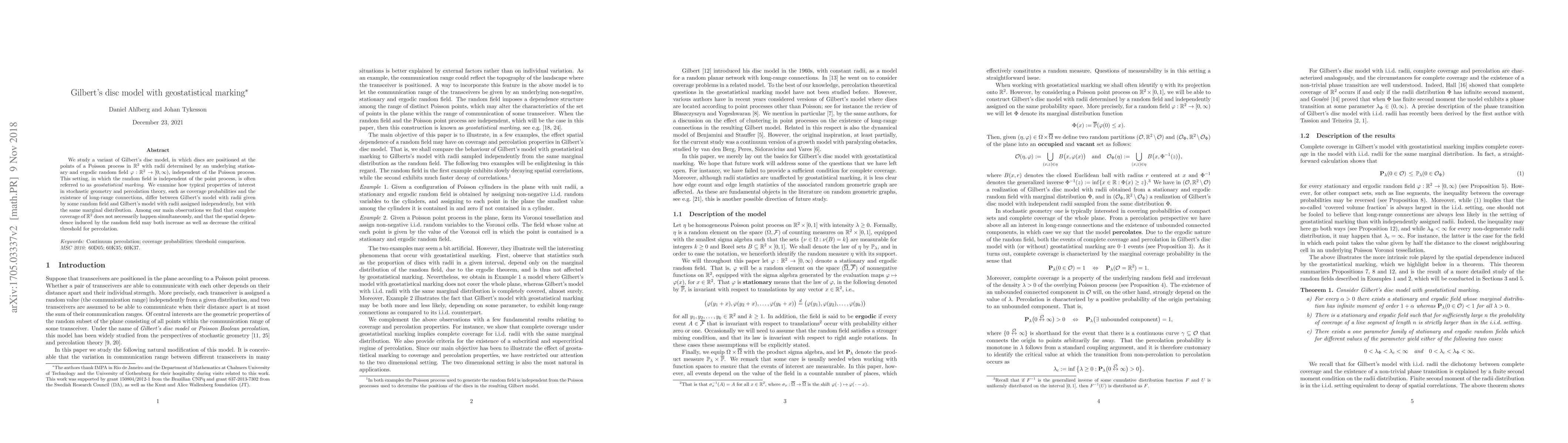 This paper explores a modified Gilbert's disc model where disc radii are determined by a geostatistical marking random field, examining differences in coverage probabilities and percolation thresholds compared to a standard model with independent radii. It finds that complete coverage and percolation thresholds can vary significantly due to spatial dependencies introduced by the random field.