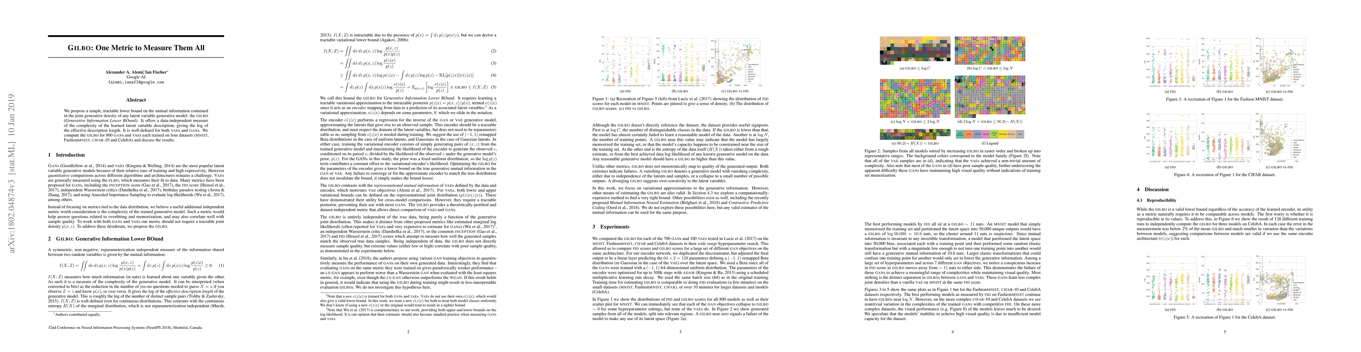The paper proposes GILBO, a data-independent measure of the complexity of latent variable generative models like VAEs and GANs, offering a lower bound on mutual information. The authors compute GILBO for 800 models trained on four datasets and discuss its implications.