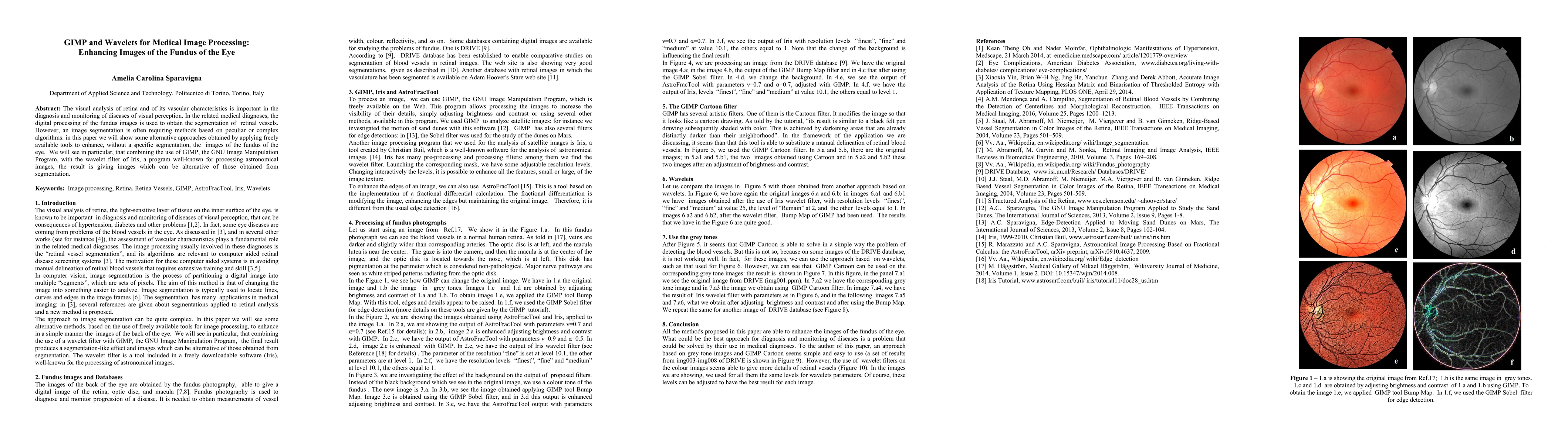 This paper explores the use of GIMP and wavelet filters from Iris to enhance fundus images of the eye without relying on traditional segmentation methods, offering an alternative approach for visual analysis of retinal vascular characteristics in medical diagnostics. The combination of these tools provides improved image quality for disease diagnosis and monitoring.