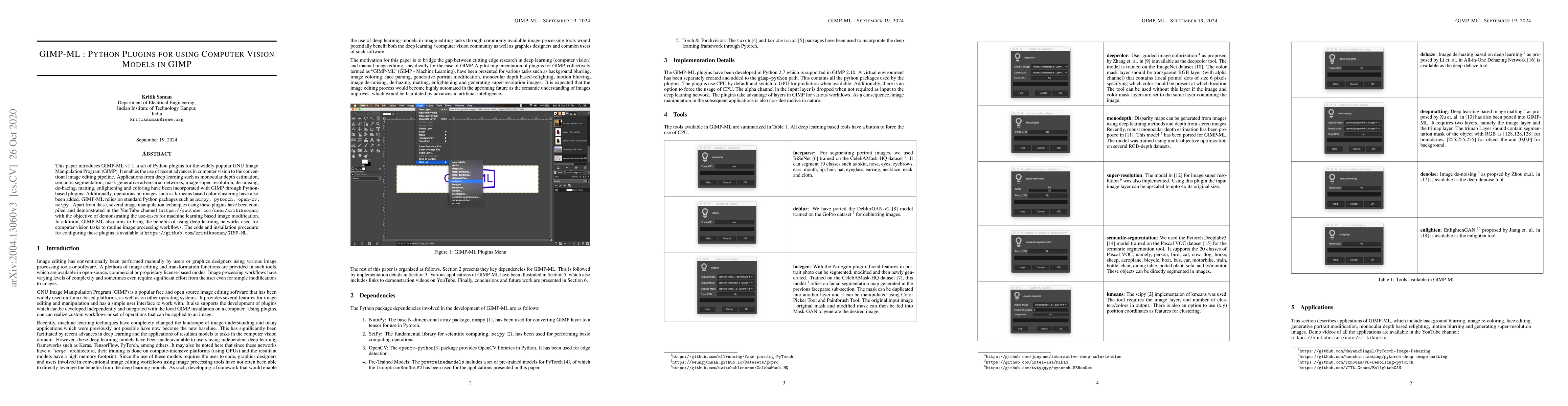 GIMP-ML v1.1 introduces Python plugins for integrating advanced computer vision models into GIMP, enabling tasks like depth estimation and image super-resolution. The plugins utilize standard Python packages and are available for installation on GitHub.