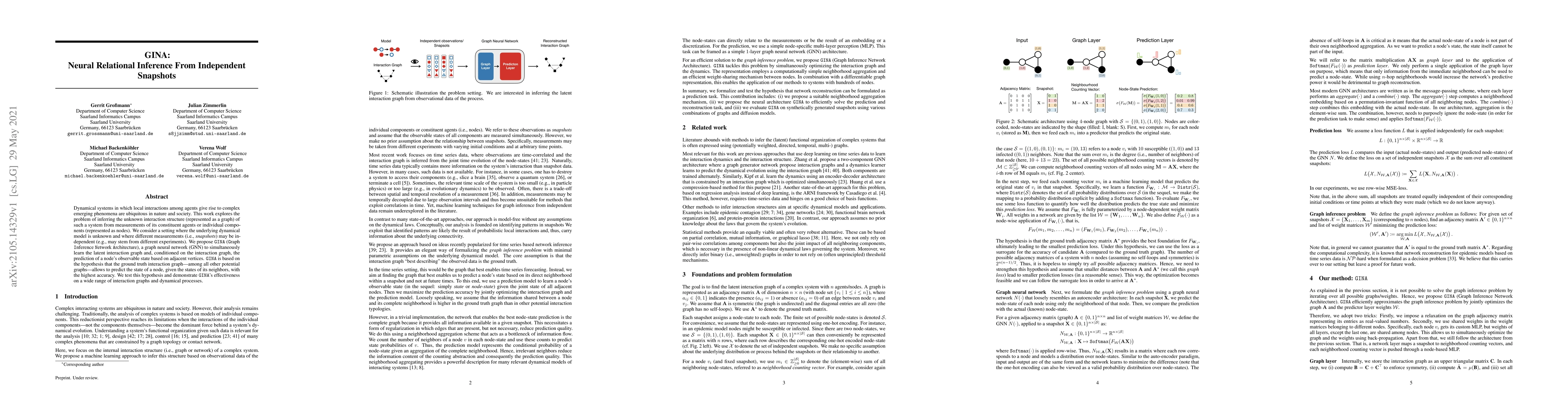 Dynamical systems in which local interactions among agents give rise to complex emerging phenomena are ubiquitous in nature and society. This work explores the problem of inferring the unknown interaction structure (represented as a graph) of such a system from measurements of its constituent agents or individual components (represented as nodes). We consider a setting where the underlying dynamical model is unknown and where different measurements (i.e., snapshots) may be independent (e.g., may stem from different experiments). We propose GINA (Graph Inference Network Architecture), a graph neural network (GNN) to simultaneously learn the latent interaction graph and, conditioned on the interaction graph, the prediction of a node's observable state based on adjacent vertices. GINA is based on the hypothesis that the ground truth interaction graph -- among all other potential graphs -- allows to predict the state of a node, given the states of its neighbors, with the highest accuracy. We test this hypothesis and demonstrate GINA's effectiveness on a wide range of interaction graphs and dynamical processes.
