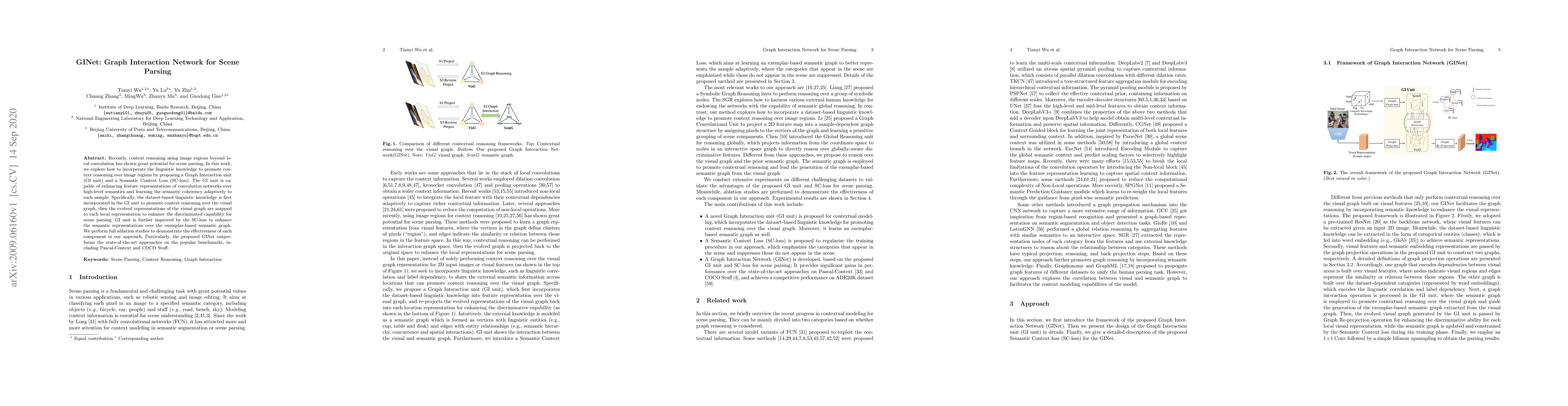 GINet introduces a Graph Interaction unit (GI unit) and Semantic Context Loss (SC-loss) to enhance scene parsing by incorporating linguistic knowledge for context reasoning over image regions. The GI unit and SC-loss improve feature representations and semantic coherence, outperforming state-of-the-art on benchmarks like Pascal-Context and COCO Stuff.