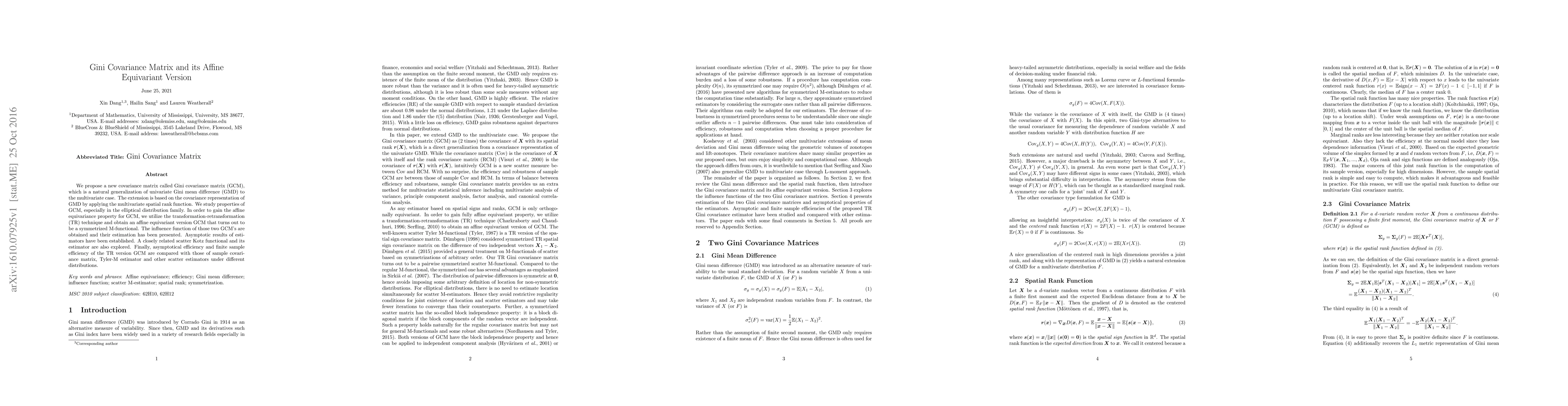 This paper introduces the Gini covariance matrix (GCM), a multivariate extension of the Gini mean difference, and its affine equivariant version obtained via the transformation-retransformation technique. The study compares the efficiency of the proposed GCM estimators with traditional covariance and other scatter estimators under various distributions.