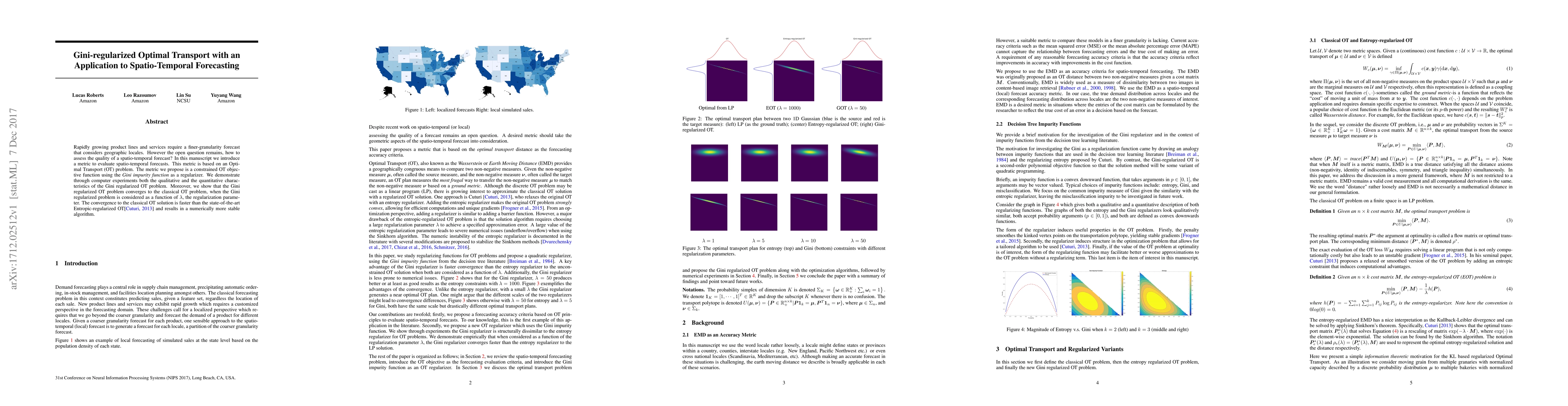Rapidly growing product lines and services require a finer-granularity forecast that considers geographic locales. However the open question remains, how to assess the quality of a spatio-temporal forecast? In this manuscript we introduce a metric to evaluate spatio-temporal forecasts. This metric is based on an Opti- mal Transport (OT) problem. The metric we propose is a constrained OT objec- tive function using the Gini impurity function as a regularizer. We demonstrate through computer experiments both the qualitative and the quantitative charac- teristics of the Gini regularized OT problem. Moreover, we show that the Gini regularized OT problem converges to the classical OT problem, when the Gini regularized problem is considered as a function of {\lambda}, the regularization parame-ter. The convergence to the classical OT solution is faster than the state-of-the-art Entropic-regularized OT[Cuturi, 2013] and results in a numerically more stable algorithm.