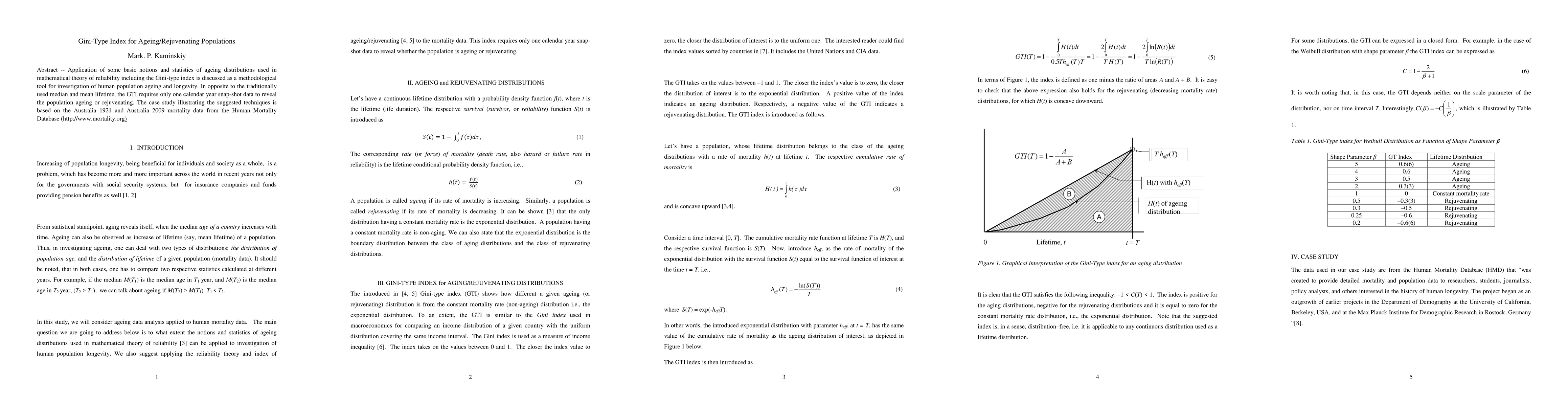 Application of some basic notions and statistics of ageing distributions used in mathematical theory of reliability including the Gini-type index is discussed as a methodological tool for investigation of human population ageing and longevity. In opposite to the traditionally used median and mean lifetime, the GTI requires only one calendar year snap-shot data to reveal the population ageing or rejuvenating. The case study illustrating the suggested techniques is based on the Australia 1921 and Australia 2009 mortality data from the Human Mortality Database (http://www.mortality.org)