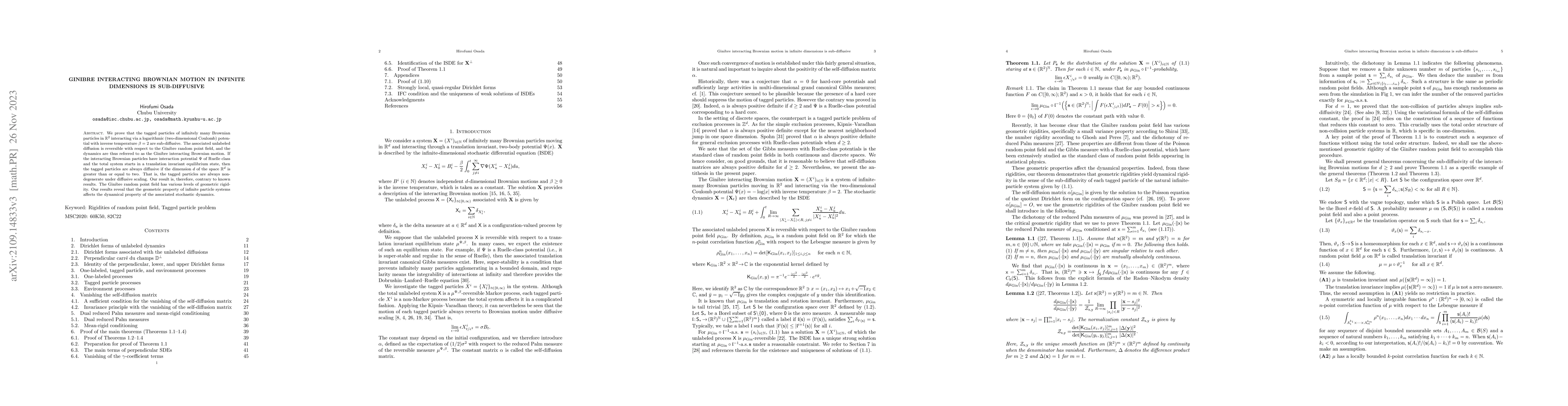 We prove that the tagged particles of infinitely many Brownian particles in $ \Rtwo $ interacting via a logarithmic (two-dimensional Coulomb) potential with inverse temperature $ \beta = 2 $ are sub-diffusive. The associated delabeled diffusion is reversible with respect to the Ginibre random point field, and the dynamics are thus referred to as the Ginibre interacting Brownian motion. % If the interacting Brownian particles have interaction potential $ \Psi $ of Ruelle class and the total system starts in a translation-invariant equilibrium state, then the tagged particles are always diffusive if the dimension $ \dd $ of the space $ \mathbb{R}^{\dd } $ is greater than or equal to two. That is, the tagged particles are always non-degenerate under diffusive scaling. Our result is, therefore, contrary to known results. The Ginibre random point field has various levels of geometric rigidity. Our results reveal that the geometric property of infinite particle systems affects the dynamical property of the associated stochastic dynamics.