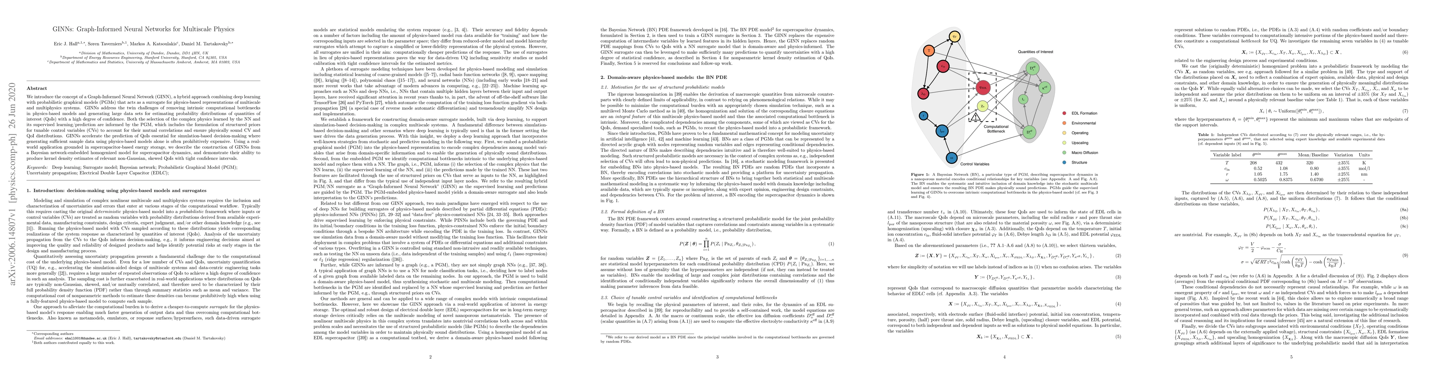 This paper introduces Graph-Informed Neural Networks (GINNs), a hybrid deep learning and probabilistic graphical model approach for simulating multiscale and multiphysics systems. GINNs aim to overcome computational bottlenecks and generate reliable data for estimating quantities of interest, demonstrating effectiveness in modeling supercapacitor dynamics.